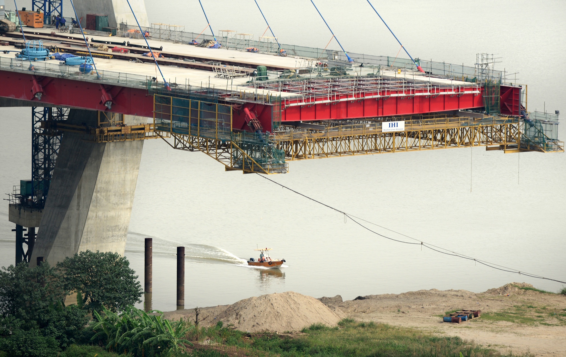 | Tại cả 5 trụ tháp chưa được nối liền với đường dẫn nằm giữa dòng, công nhân được đưa đón bằng ca nô qua lại hàng ngày để làm việc. |