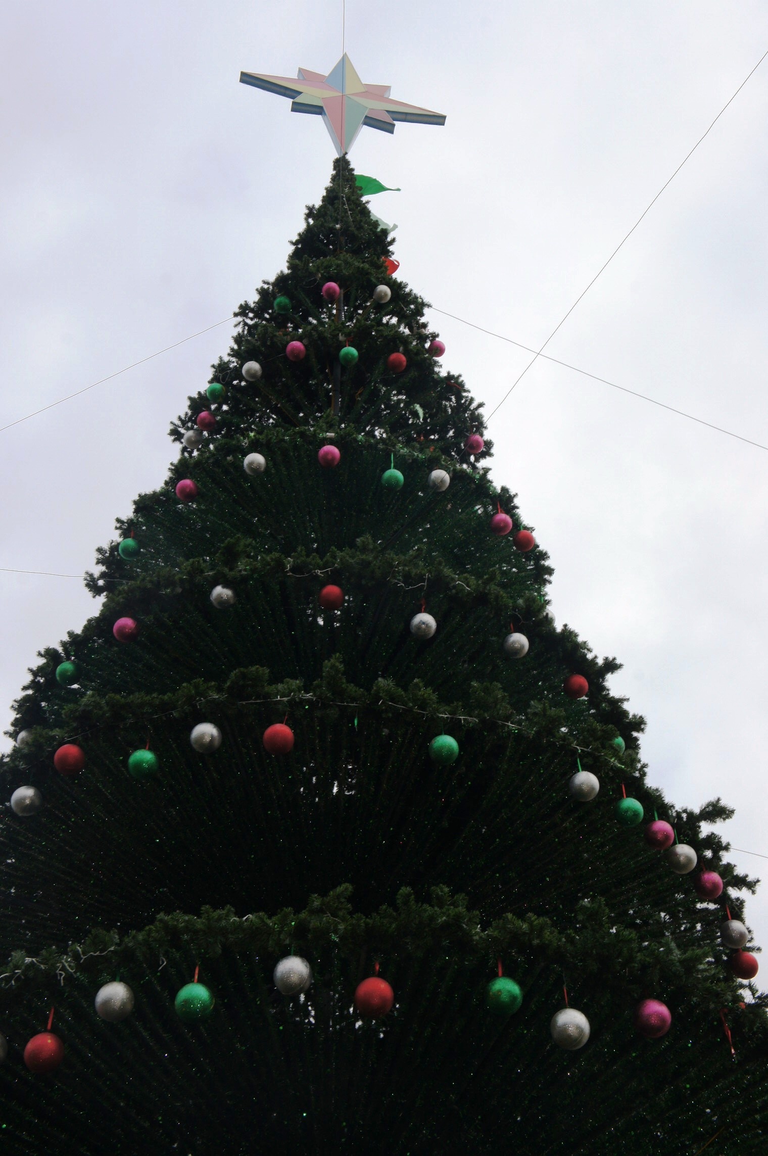 | Cây thông được mắc 1.000 giàn đèn nháy, kết nối hàng vạn lá nhựa thông đặt mua từ Sài Gòn cùng với hàng ngàn quả chuông, trái bóng. |