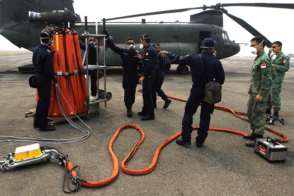 | Binh sĩ Singapore và các thiết bị chữa cháy bên cạnh trực thăng Chinook của không quân Singapore đậu tại căn cứ ở phía nam đảo Sumatra. Ngày 19/10, Bộ trưởng Quốc phòng Singapore Ng Eng Hen cho biết các binh sĩ đã dội "bom nước" ở 47 điểm nóng, dập tắt hoàn toàn 35 đám cháy ở Palembang, thủ phủ của tỉnh Nam Sumatra. Ảnh: AFP |