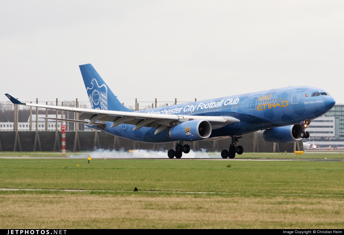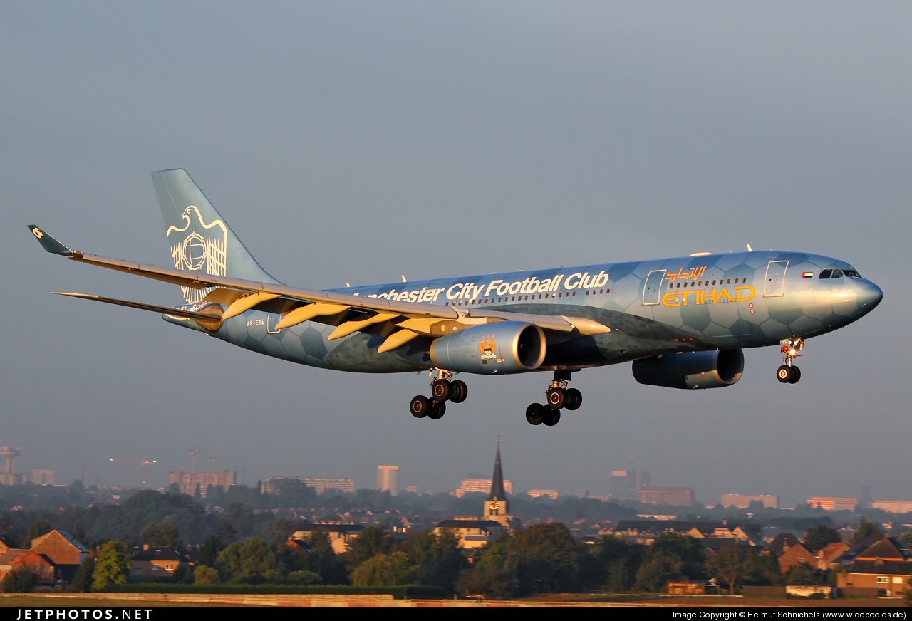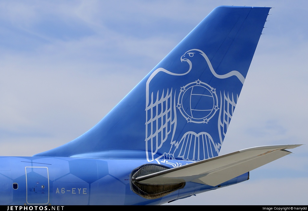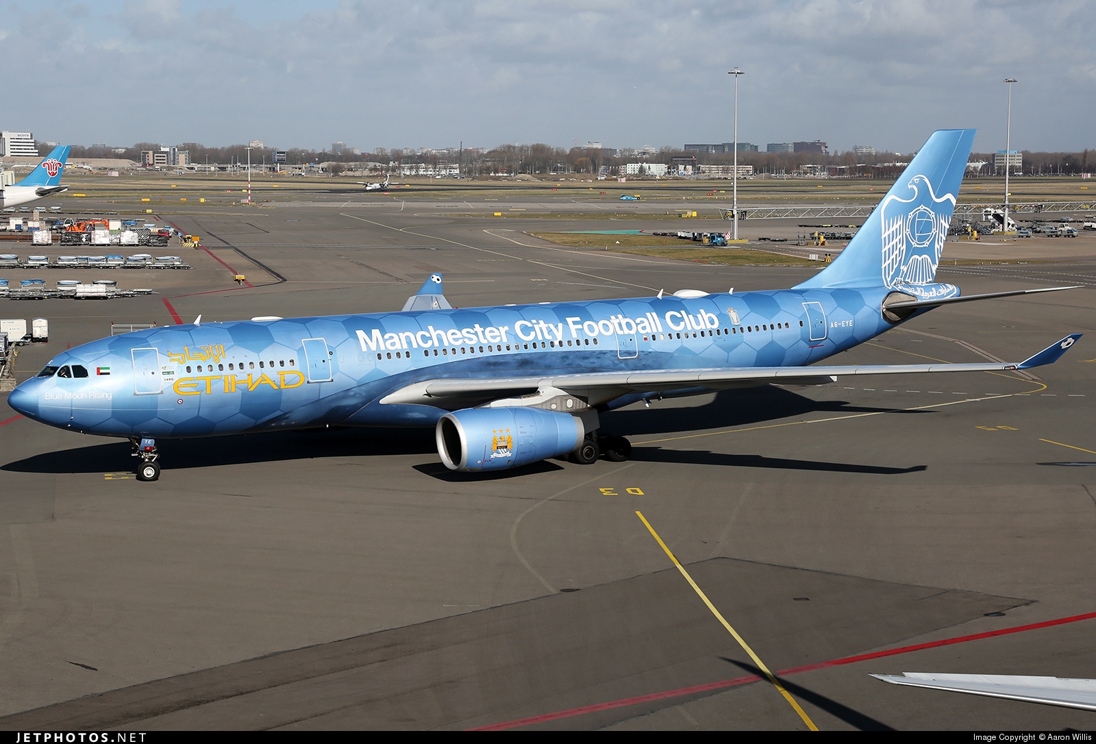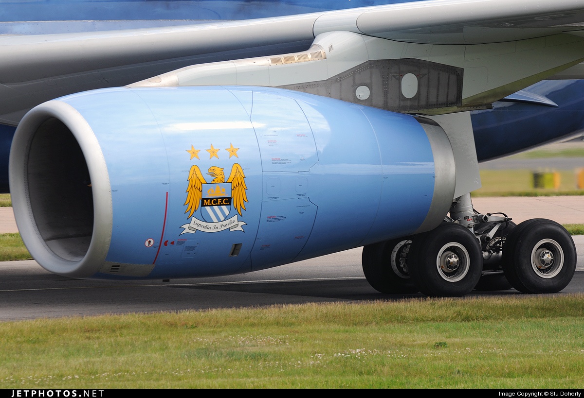 | Phần đuôi máy bay in hình chú đại bàng và biểu tượng sân vận động Etihad - sân nhà của CLB Manchester City. |