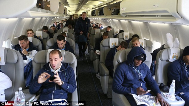 | Các cầu thủ Manchester City đọc báo, nghe nhạc, thư giãn trong thời gian di chuyển trên chuyên cơ của đội. |