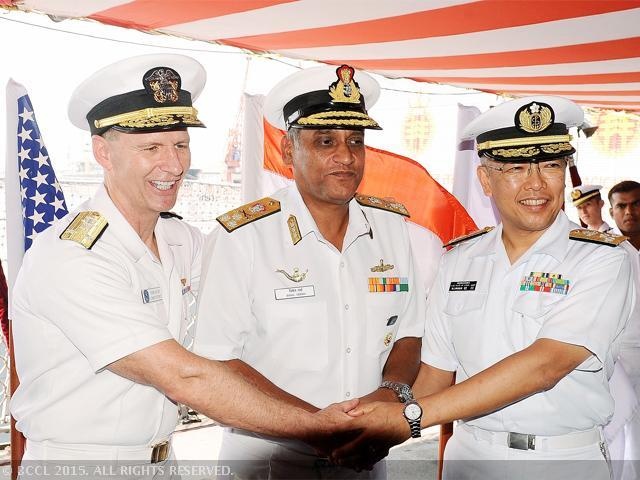 | Tư lệnh Hạm đội 7 của Mỹ, Phó Đô đốc JP Aucoin, cùng Đô đốc Nirmal Verma, Tư lệnh Lục quân Ấn Độ và phó tham mưu trưởng Lực lượng phòng vệ biển Nhật Bản, Phó Đô đốc Murakawa bắt tay trong ngày đầu của cuộc tập trận hải quân Malabar. Việc Mỹ và Ấn Độ quyết định mở rộng quy mô Malabar bằng cách mời thêm Nhật Bản tham gia diễn ra chỉ vài ngày sau khi các quan chức Bộ quốc phòng Mỹ quan ngại về những hành động của Trung Quốc trên Biển Đông và trong khu vực. Ảnh: Indiatimes |