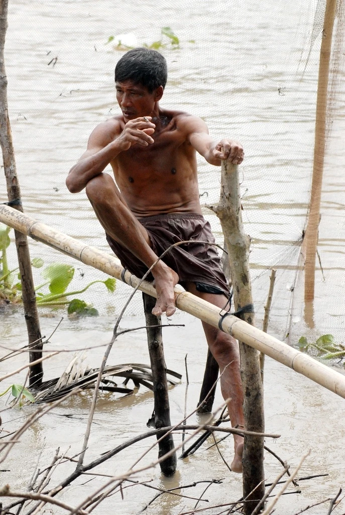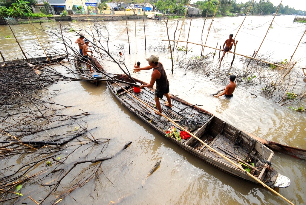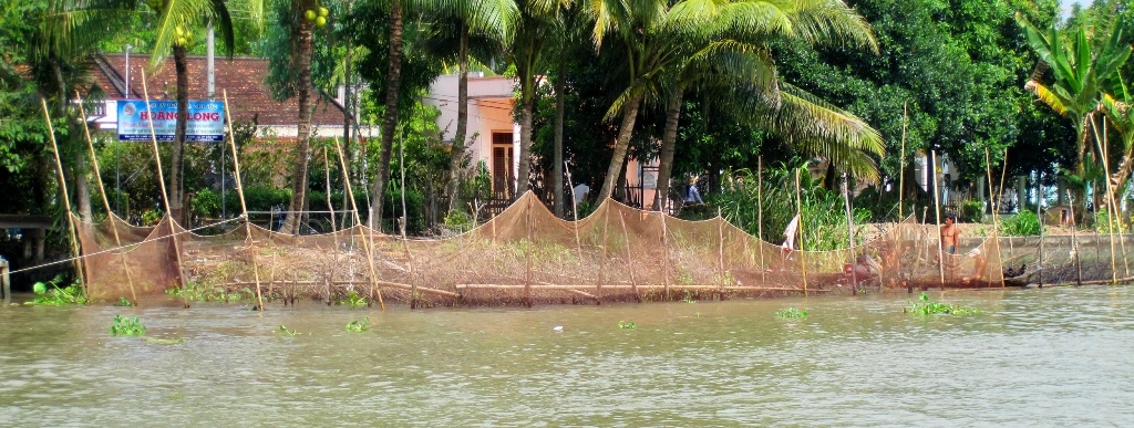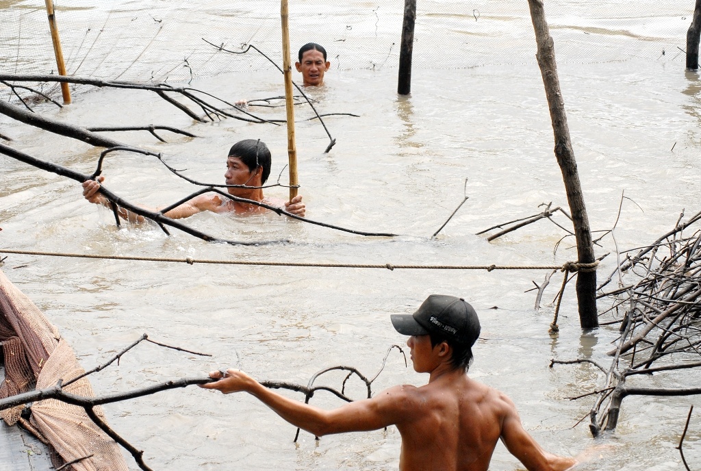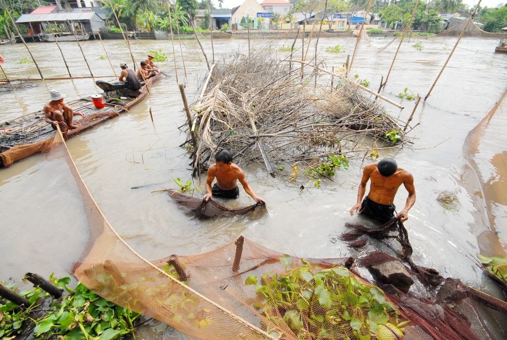 Lưới bao xung quanh để chuẩn bị dỡ chà bắt cá, tôm.