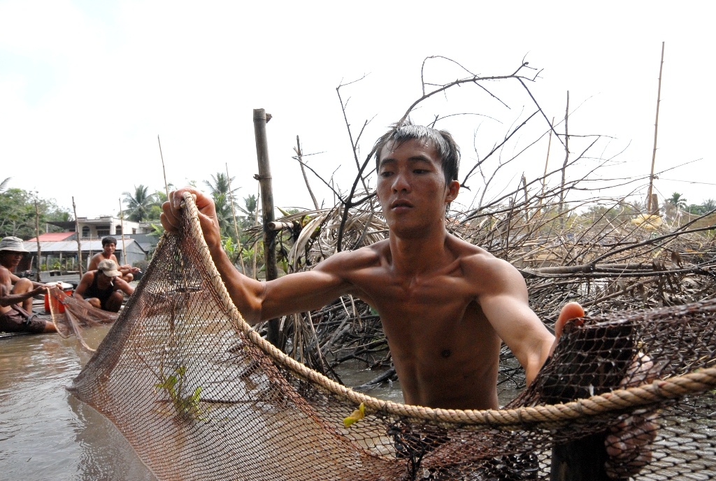 Tiến hành dỡ những nhánh chà ra khỏi lưới.