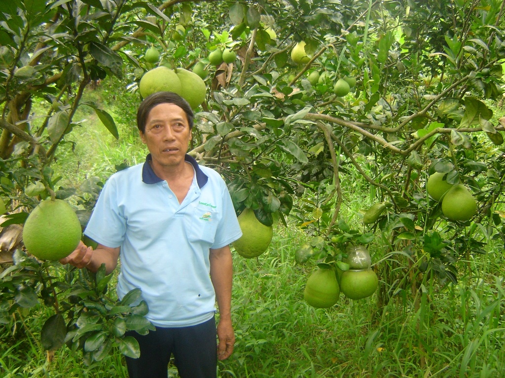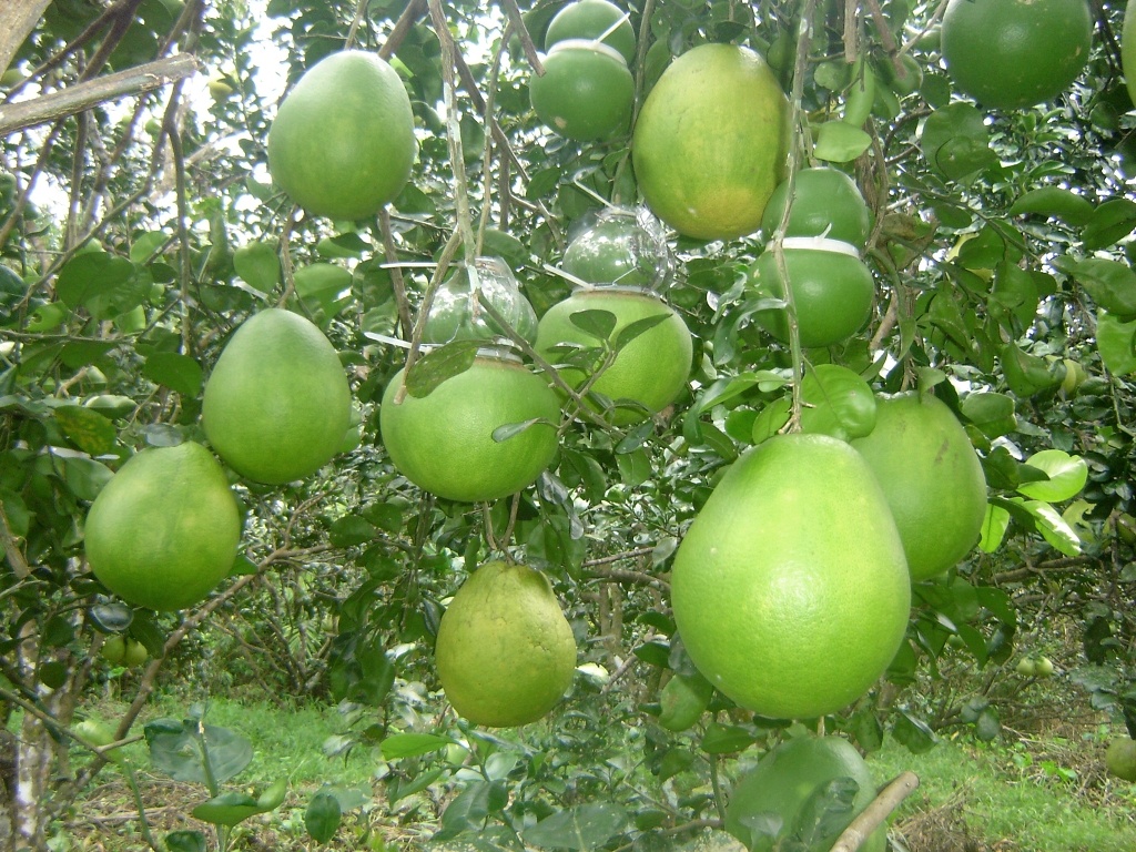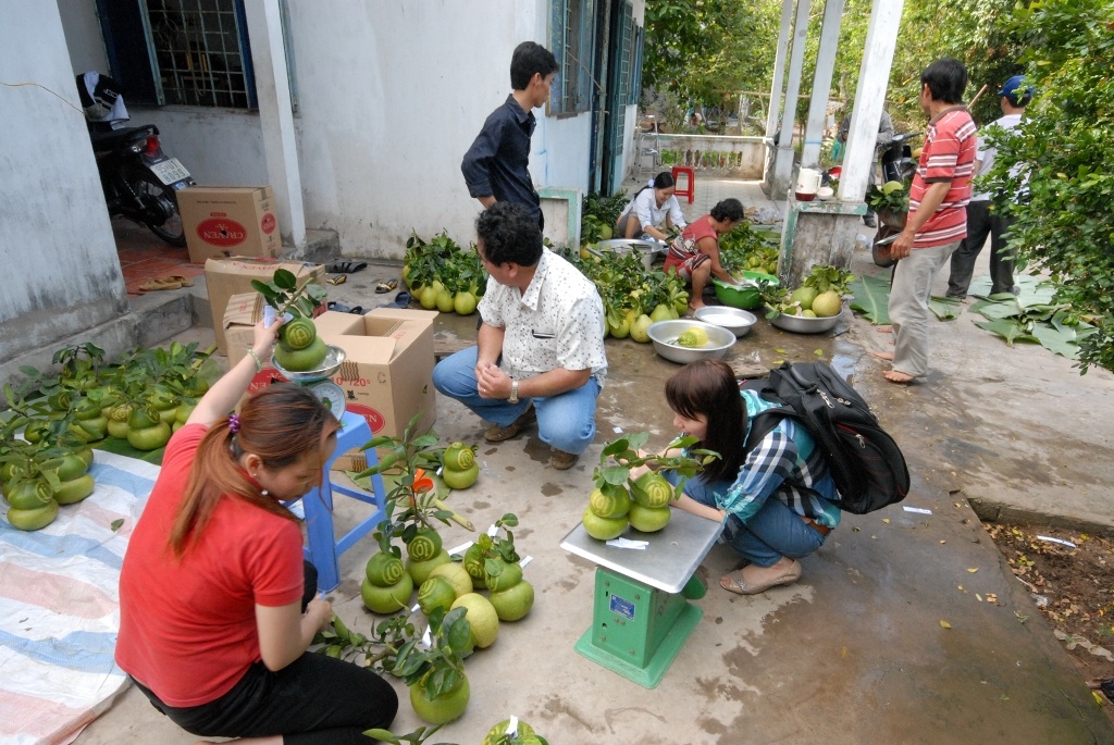 | Một số nhà vườn cũng đã thu hoạch những trái bưởi đầu tiên làm mẫu quảng bá cho dịp tết Giáp Ngọ 2014 hoặc để chưng trong các đám tiệc ở nông thôn. Mỗi trái bưởi hồ lô thông thường nặng từ 1,8 -2,5 kg. |