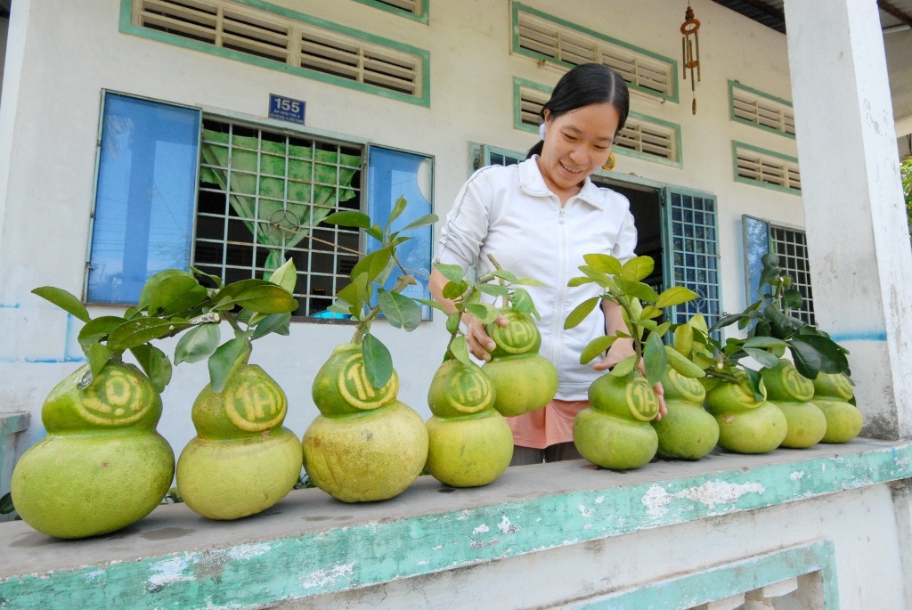 | Ông Võ Trung Thành, Chủ nhiệm Câu lạc bộ Khuyến nông Phú Trí A, xã Phú Tân, huyện Châu Thành cho hay, nếu như năm ngoái câu lạc bộ sản xuất khoảng 8.000 trái bưởi hồ lô bán tết thì năm nay chỉ làm được 5.320 trái. Số lượng giảm do thời tiết bất lợi, mưa bão nhiều làm bưởi hư bông và rụng trái hàng loạt. Cái mới năm nay là câu lạc bộ sẽ đưa ra thị trường 2 sản phẩm “độc”: Bưởi hồ lô tài lộc thỏi vàng và bưởi hồ lô lò kim đơn “Phúc Lộc Thọ”. |
