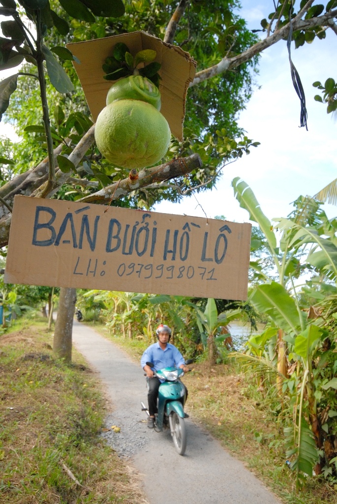 Thời điểm này, những "bảng quảng cáo" bán bưởi hồ lô như thế này đã được dựng tại rất nhiều nhà vườn miền Tây. Nếu như tết năm 2013, giá bưởi hồ lô dao động từ 300.000- 700.000 đồng/trái (tùy lớn nhỏ), thì tết năm 2014, dự kiến giá tăng 20%, từ 400.000-900.000 đồng/trái.