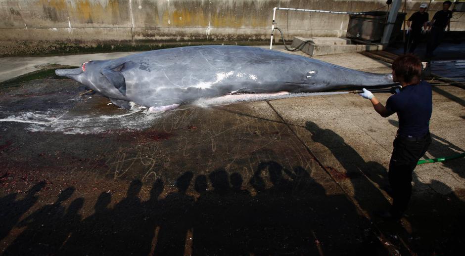 Người ta rửa sạch con cá voi tại một xưởng xẻ thịt gần cảng Wada, thị trấn ven biển Minamiboso, tỉnh Chiba, miền nam Nhật Bản. Sau khi bắt cá voi, ngư dân đưa chúng tới các xưởng để xẻ thịt và cung cấp cho những người có nhu cầu. Các hoạt động như thế diễn ra công khai ở Nhật Bản. Thịt cá voi là thực phẩm truyền thống của người dân Nhật Bản nên các hoạt động đánh bắt loài sinh vật này vẫn diễn ra phổ biến bất chấp các nỗ lực bảo tồn của cả thế giới. |