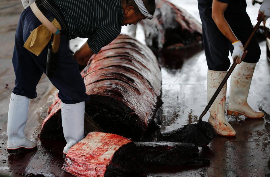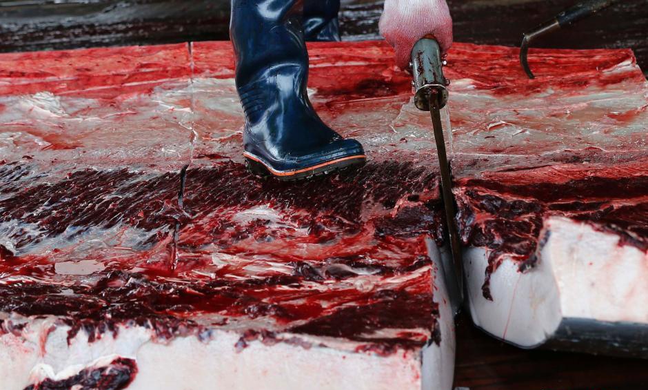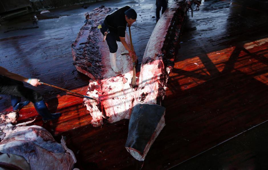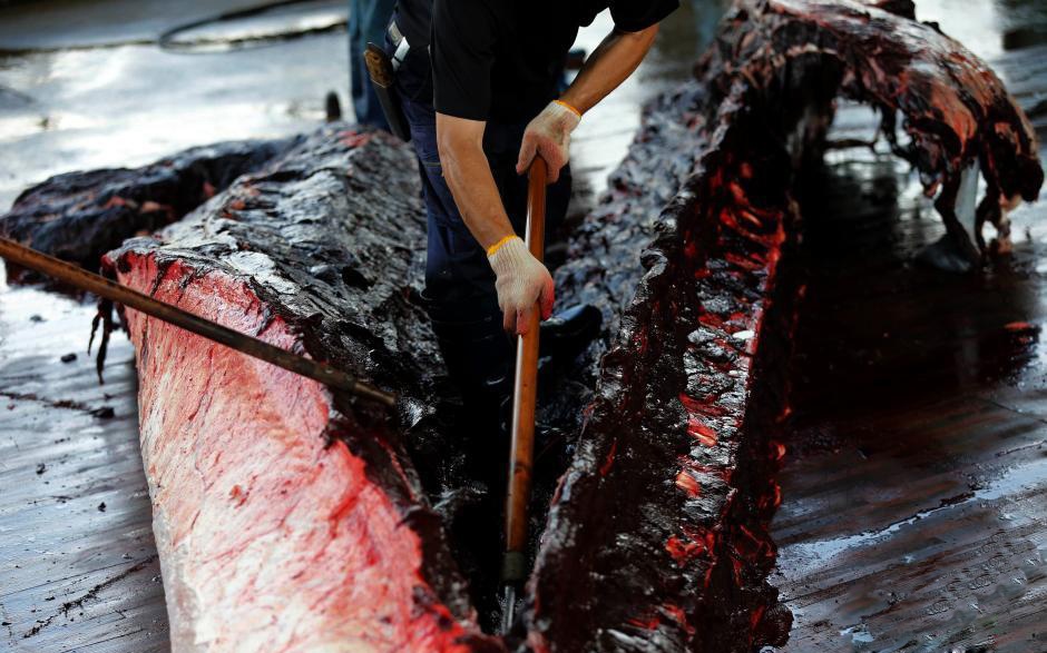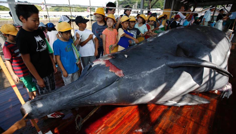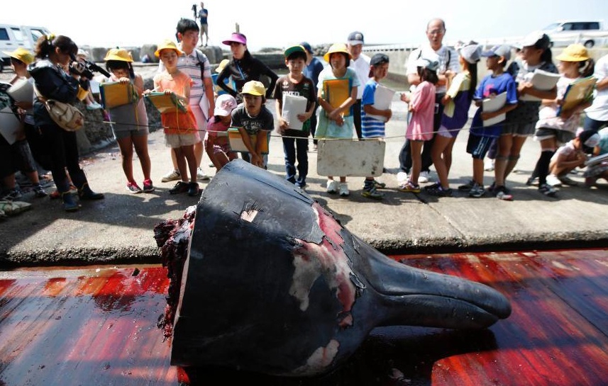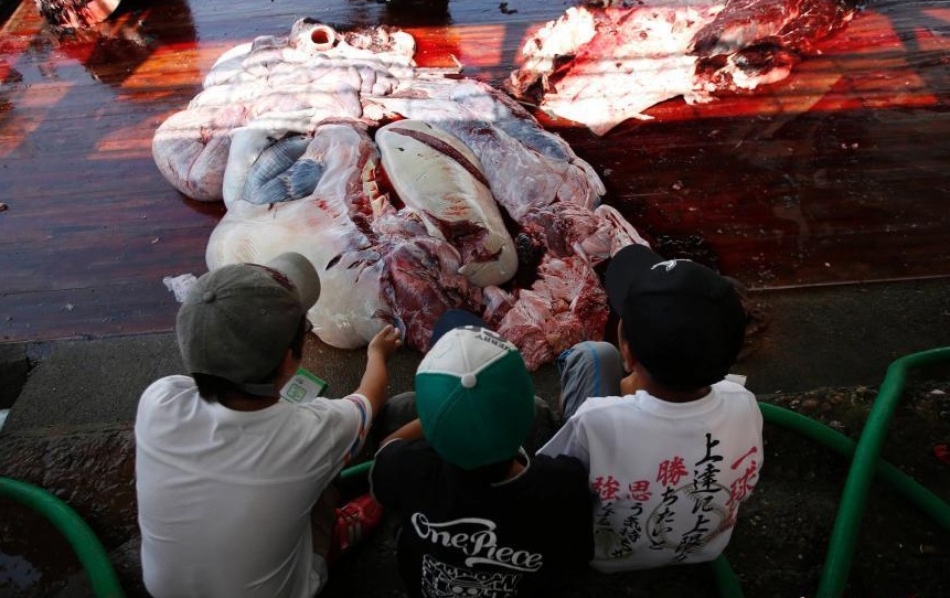 Đầu một con cá voi lìa khỏi cơ thể. Người ta cho trẻ em quan sát quá trình xẻ thịt cá voi. Người dân Nhật coi việc xẻ thịt cá voi là hoạt động bình thường trong khi phần lớn các nước trên thế giới đều cấm. |