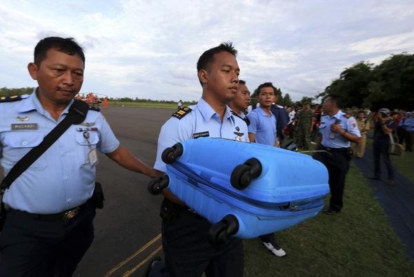 Chiếc vali màu xanh, nghi là của hành khách trên chuyến bay định mệnh được ông Dwi Putranto, một quan chức không quân cấp cao giới thiệu trước báo giới. Sự hiện diện của nó góp phần khẳng định máy bay Airbus A320 đã lao xuống biển. |