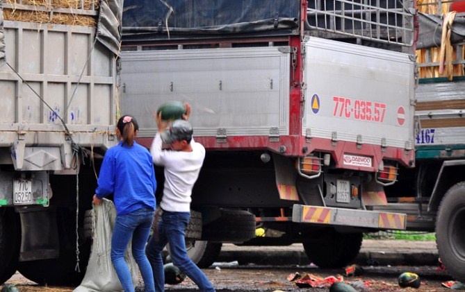 | "Đội quân" hôi dưa có từ 2 đến 3 người, người leo lên xe lục tung thùng xe để lấy dưa, rồi ném xuống cho người đứng dưới đỡ và đưa vào bao bì. |