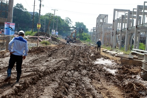 | Đường đi vào công trình ngập bùn đất gây cản trở việc thi công. |