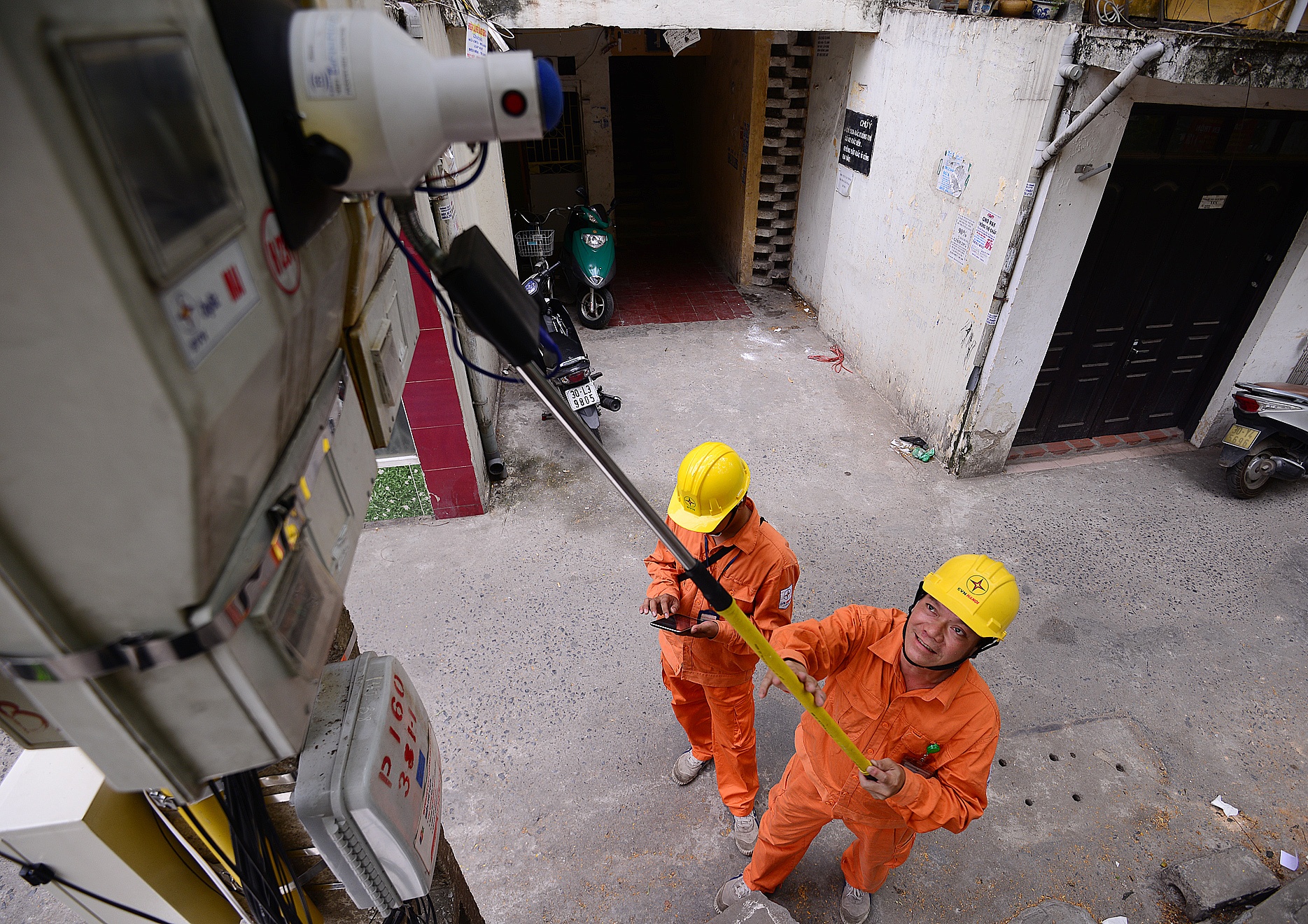 Việc áp dụng công nghệ với "gậy tự sướng" để ghi số điện trên công tơ ngoài đường phố giúp các công nhân EVN Hà Nội đỡ vất vả hơn thời bắc thang, trèo cột.