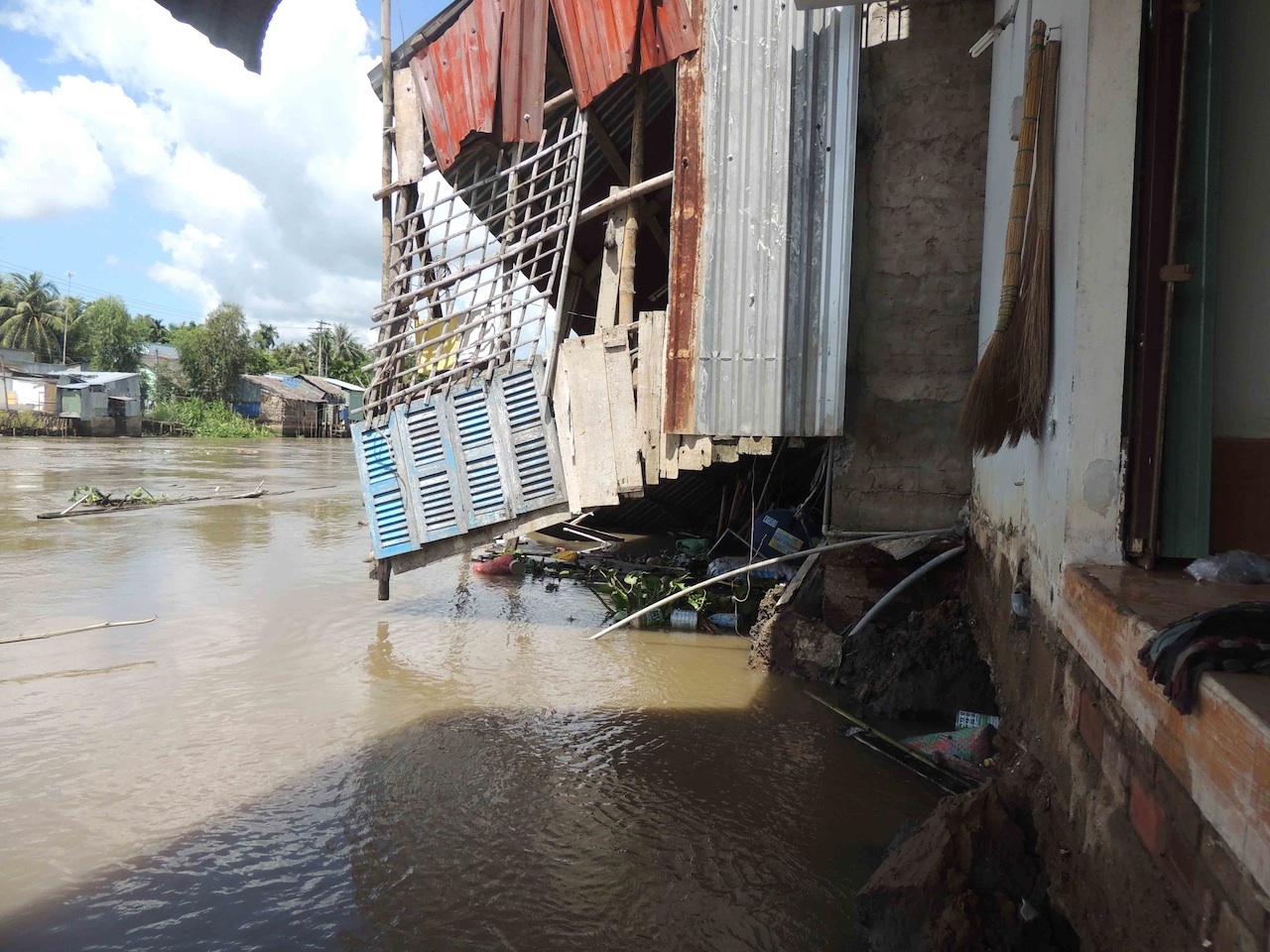 Bà Nguyễn Thị Châu, có nhà bị sạt lở nghiêm trọng nhất, kể: “Lúc 6h sáng tôi ra phía sau nhà gần mé sông thì thấy vết nứt trên nền nên gọi mọi người di chuyển tài sản ra ngoài. Tuy nhiên, khi mọi người chưa đến thì nghe nhiều tiếng nổ lớn, sau đó nền nhà bị sạt, chìm hết xuống sông".