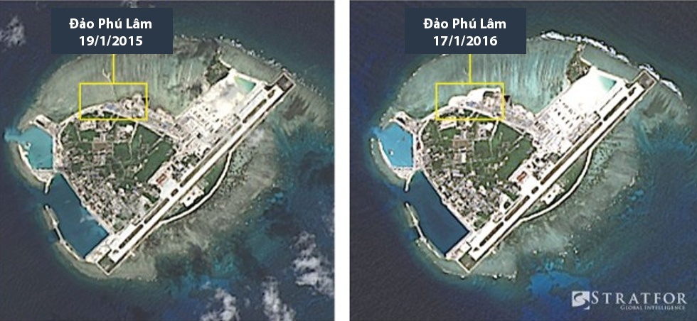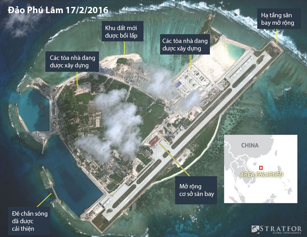 Toàn cảnh đảo Phú Lâm thuộc quần đảo Hoàng Sa của Việt Nam trong ảnh vệ tinh do DigitalGlobe chụp ngày 17/2 vừa qua. Ảnh cho thấy rõ đê chắn sóng đã được cải thiện, các tòa nhà đang được xây dựng, khu đất mới bồi lấp và đường băng đã được mở rộng. Ngày 18/2, Hoàn cầu Thời báo dẫn nguồn tin của Bộ Quốc phòng Trung Quốc xác nhận nước này "đã triển khai vũ khí tới đảo Phú Lâm từ lâu". Tuy nhiên, tờ này không nói rõ về loại vũ khí và còn lớn tiếng nói rằng truyền thông phương Tây dường như đang thổi phồng về "mối đe doạ Trung Quốc". |