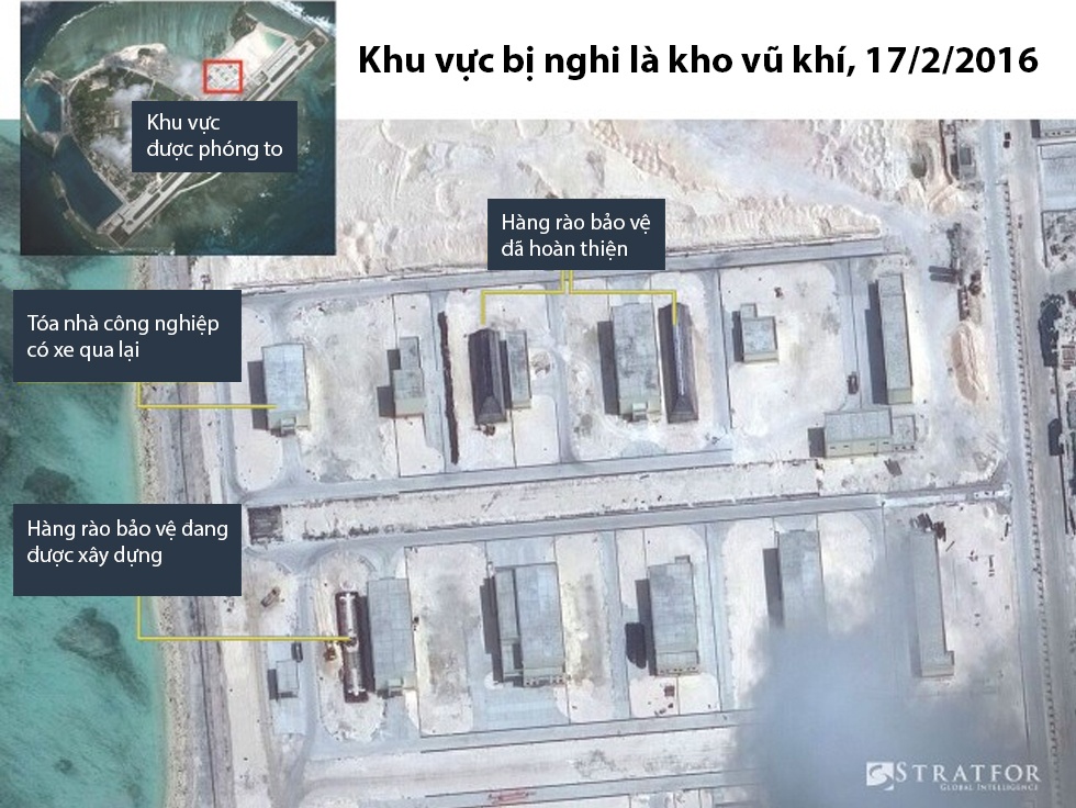 Từ ảnh vệ tinh, các kỹ thuật viên dựng lên bản đồ họa mô phỏng kho vũ khí kiên cố của Trung Quốc trên đảo Phú Lâm. Tòa nhà được cho là cao 9 m, rộng 18 m và dài 42 m, với hàng rào chắn xung quanh. Ngày 9/2, đại diện Bộ Ngoại giao Việt Nam đã gặp đại diện Đại sứ quán Trung Quốc tại Hà Nội trao công hàm phản đối các hoạt động của Trung Quốc vi phạm chủ quyền của Việt Nam ở quần đảo Hoàng Sa. Cùng ngày, phái đoàn đại diện thường trực Việt Nam tại Liên Hợp Quốc đã có công hàm gửi Tổng thư ký Liên Hợp Quốc đề nghị cho lưu hành chính thức công hàm Bộ Ngoại giao Việt Nam gửi Đại sứ quán Trung Quốc nói trên. |