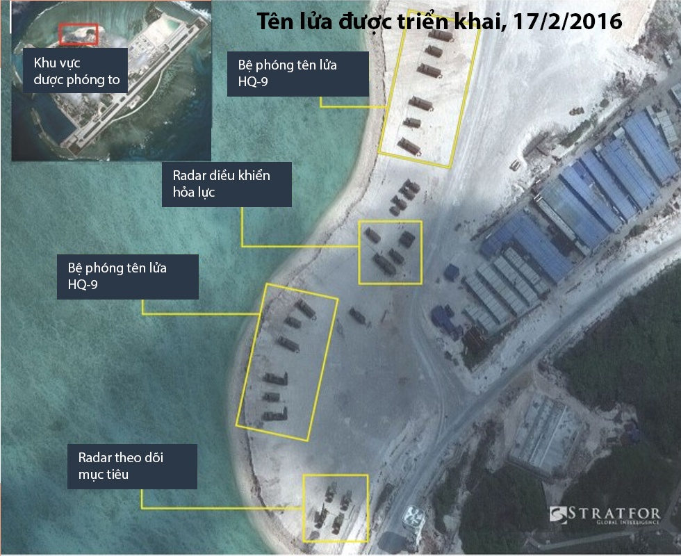 Bức ảnh thể hiện rõ các tên lửa và bệ phóng HQ-9 được triển khai tại phần mới được mở rộng. Người phát ngôn Bộ Ngoại giao Mỹ John Kirby bình luận rằng những hình ảnh về tên lửa Trung Quốc do vệ tinh thương mại phát hiện trong thời gian gần đây trên đảo Phú Lâm, thuộc quần đảo Hoàng Sa của Việt Nam, trái ngược với cam kết không quân sự hóa Biển Đông mà nhà chức trách Trung Quốc đưa ra. “Người Trung Quốc thường nói một đằng, làm một nẻo”, ông Kirby nói. |
