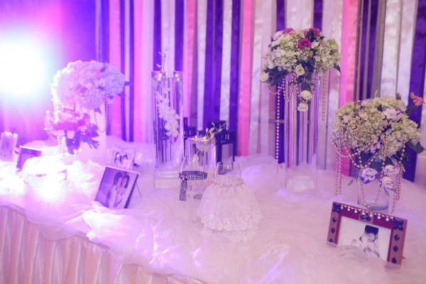 Cũng giống như hầu hết các cô dâu khác, Thanh Hằng là người đưa ra các ý tưởng cho lễ cưới của mình, quan tâm đến từng chi tiết nhỏ nhất. Chọn gam màu tím violet làm chủ đạo, người đẹp muốn có một không gian cưới tinh tế và sang trọng.