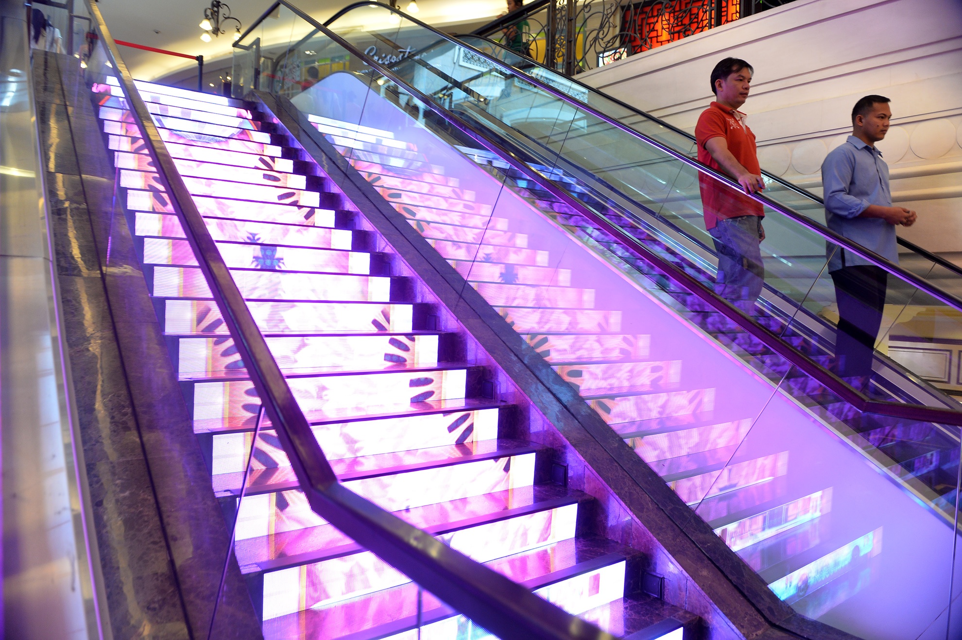 Hệ thống thang cuốn bên trong có màn hình trên từng bậc lên xuống lạ mắt, sinh động.