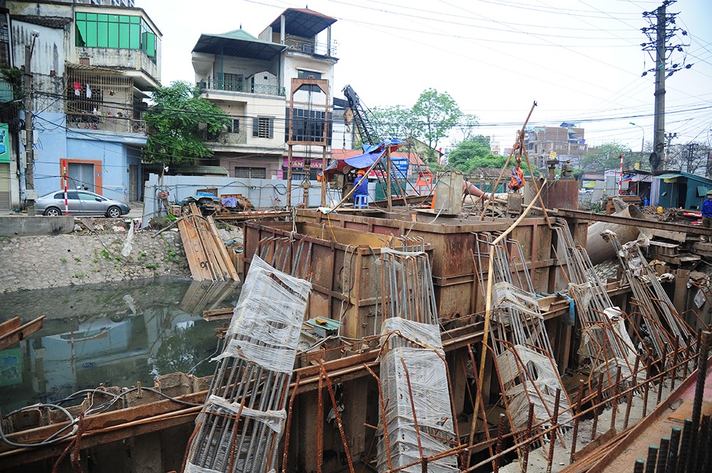 Đoạn “đỉnh tam giác” gấp khúc tại cống sông Nhuệ, chiếc cầu mới sẽ bắc chéo qua sông.