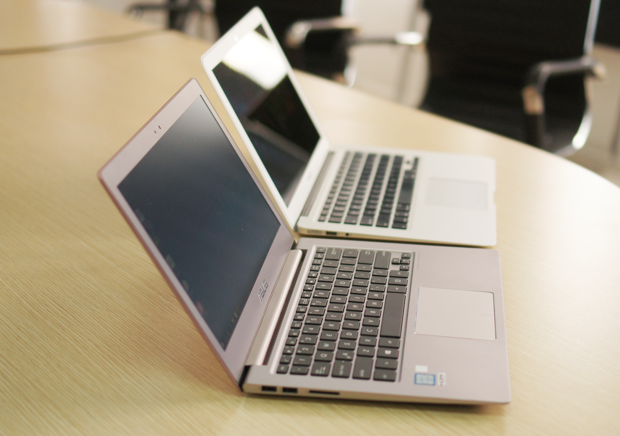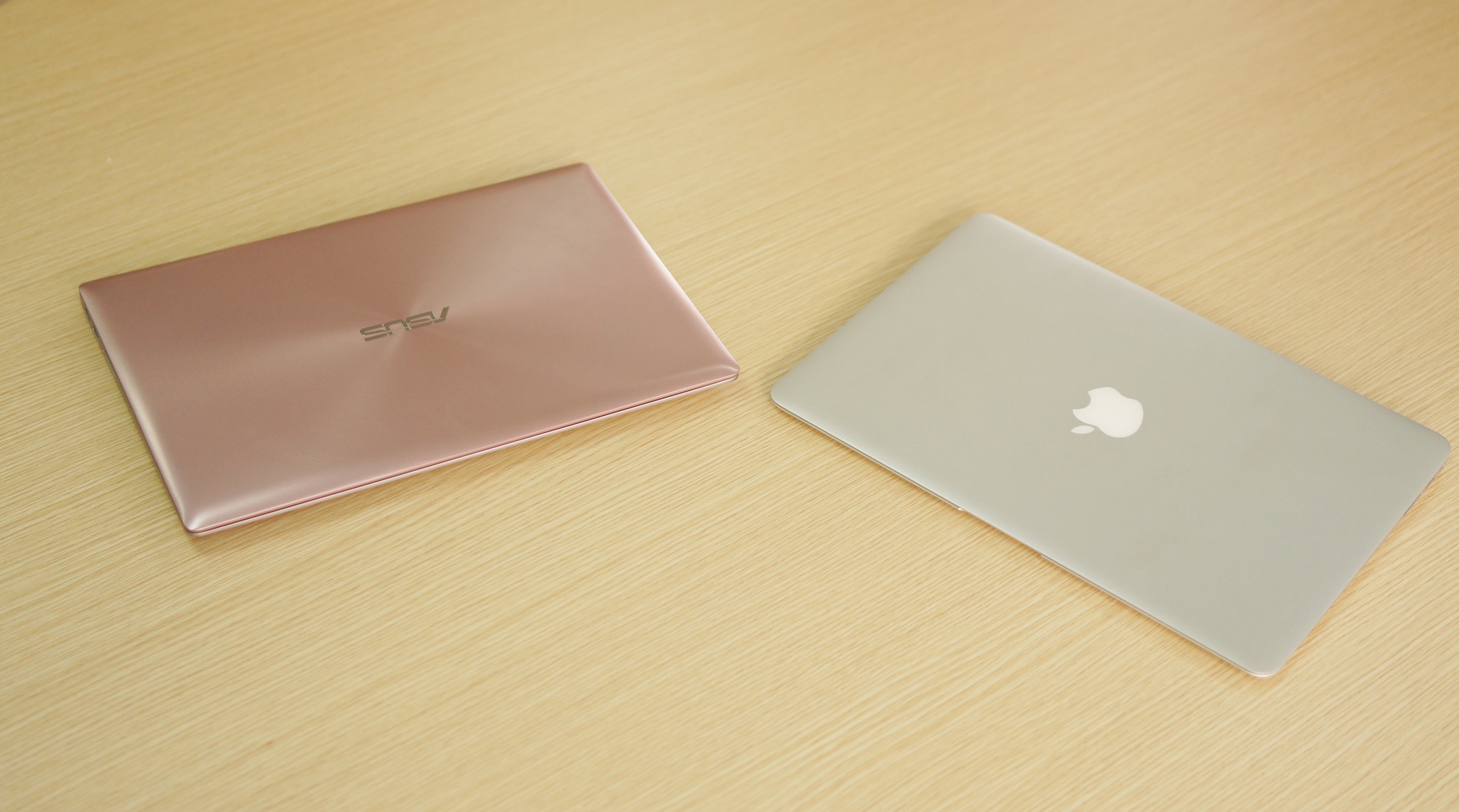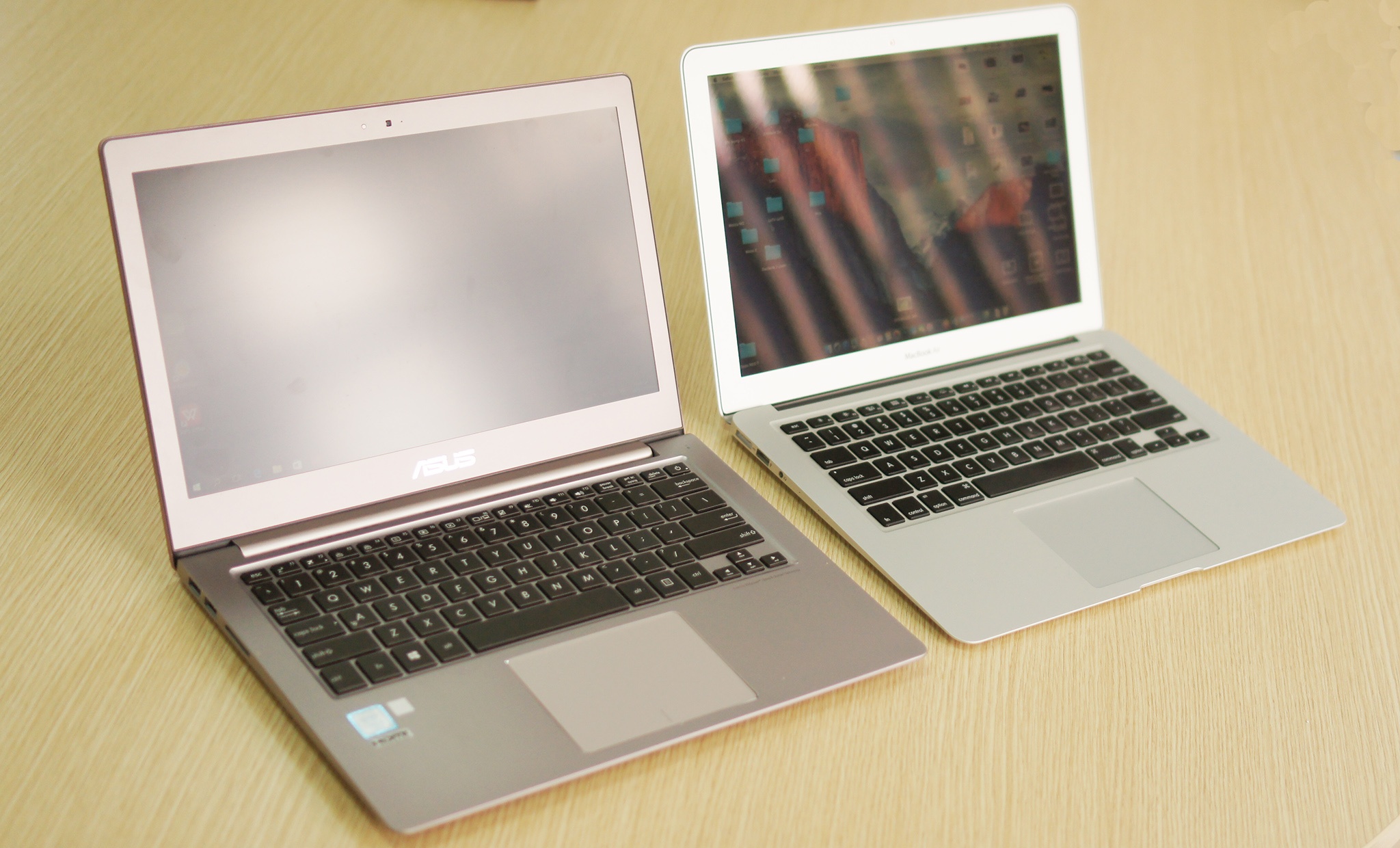 | Asus Zenbook UX303UA đọ dáng với MacBook Air 2015 13 inch. Phiên bản tiêu chuẩn của 2 thiết bị này khá tương đồng với RAM 4 GB, ổ lưu trữ SSD 128 GB và màn hình 13,3 inch. Thiết bị của Asus nặng hơn khoảng 0,15 kg, đồng thời sử dụng chip Intel Core i5 thế hệ mới Skylake trong khi MacBook Air dùng chip Broadwell. Zenbook chạy Windows 10 Single Language trong khi laptop từ Apple chạy hệ điều hành OS X. |