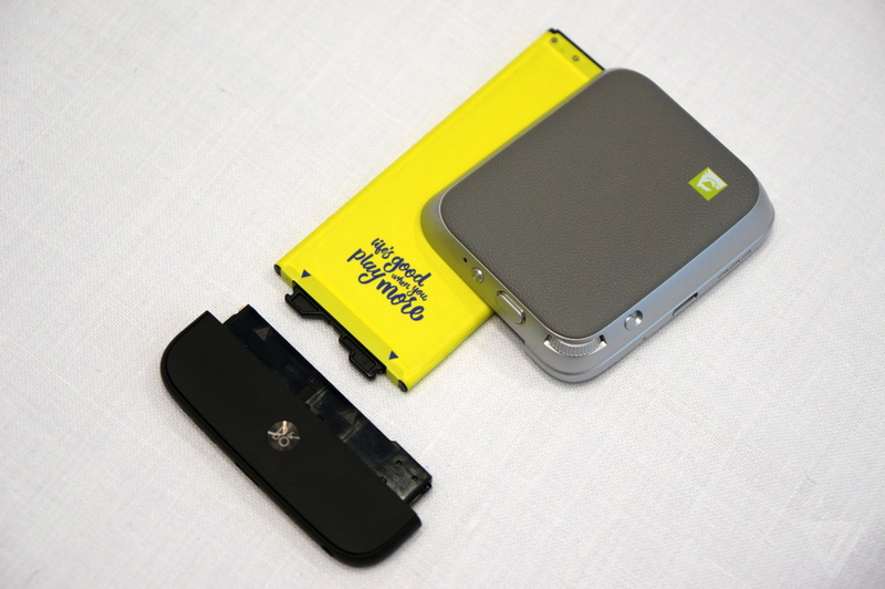 | Một trong những điểm độc đáo của G5 là nắp đuôi tháo rời, giúp người dùng dễ dàng thay thế viên pin 2.800 mAh của máy và lắp khe cắm thẻ nhớ rời. |