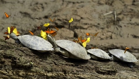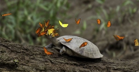 Trong chùm ảnh của hai nhà thám hiểm, các con rùa nước ngọt Bắc Mỹ đang nằm phơi nắng để thu thập nhiệt và năng lượng cho cả ngày, trong khi lũ bướm bay rợp quanh đầu.