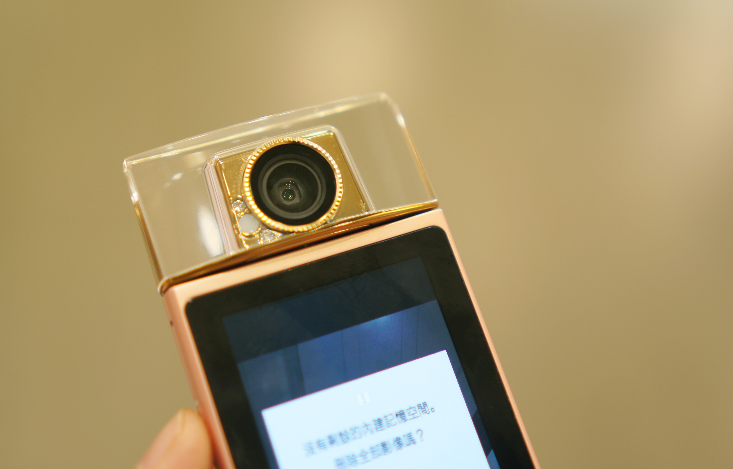 | Phía trên, người dùng có một cụm camera cực lớn, độ phân giải 19,2 megapixel, ống kính 21 mm f2.0. Camera này có thể xoay ngược 180 độ để chụp như một máy ảnh compact thông thường. Máy cũng có khả năng quay video Full HD. Camera này dùng đèn flash LED. |