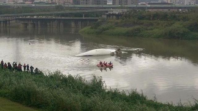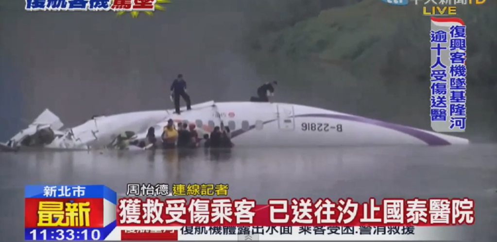Hình ảnh trên CTI News của Đài Loan cho thấy hành khách sơ tán khỏi phần thân nát vụ của chiếc ATR 72 sau khi nó lao xuống nước. |