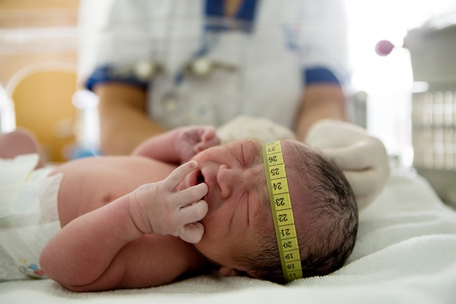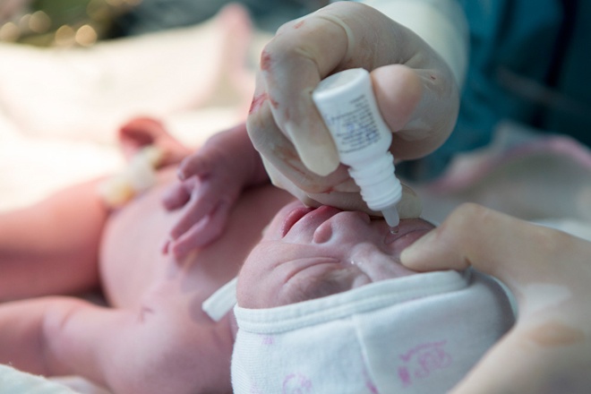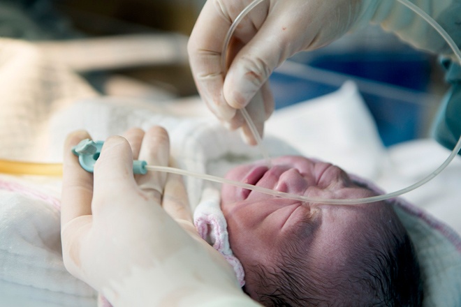 Một bé trai kháu khỉnh. Bé được hút sạch đàm nhớt ở họng, mũi giúp cho bé khóc to hơn để phổi được hoạt động, kiểm tra nhịp tim, thịp thở của bé.