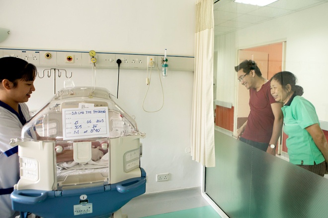 Bà và bố sung sướng nhìn con qua của kính khi chưa được gặp ngay.