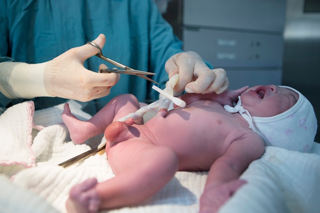 Trong khi các nhân viên kiểm tra em bé, bác sĩ sẽ lấy nhau thai ra khỏi bụng mẹ ra và bắt đầu quá trình đóng vết mổ lại.