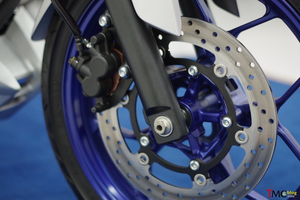 | MT-25 được trang bị phanh đĩa cả phía trước và phía sau, không hỗ trợ ABS. Bánh trước kích thước 110/70-17, bánh sau kích thước 140/70-17. |