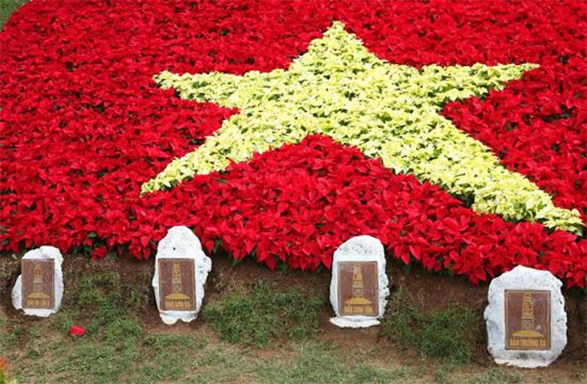 | Một thảm hoa trang trí thành cờ đở sao vàng. Xung quanh là những mốc khắc họa các đảo của Việt Nam. |