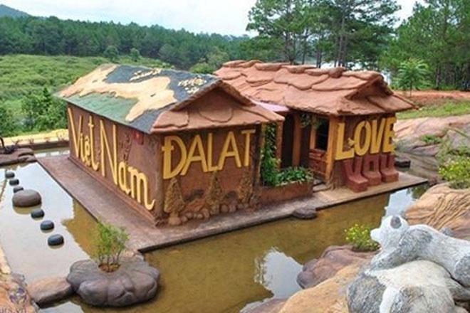 | Trung tâm của đường hầm lộ thiên còn thu hút du khách nhờ vào hai căn nhà hoàn toàn bằng đất sét nằm bên hồ Tuyền Lâm. Xung quanh vách nhà là hình ảnh về thiên nhiên, tình yêu mà tác giả dành cho Đà Lạt. Căn nhà bằng đất sét có diện tích 100m2 trên khuôn viên tổng thể 500m2. Trên tường và mái nhà được chạm khắc nổi bật bản đồ Việt Nam, bao gồm hai quần đảo Hoàng Sa và Trường Sa như một lời nhắc nhủ về chủ quyền dân tộc. |