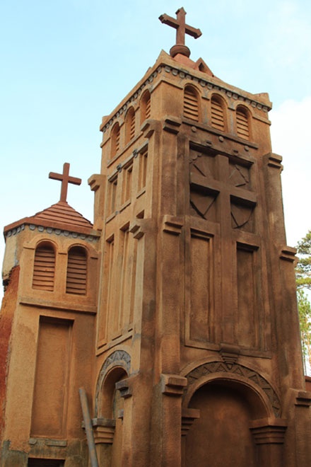 | Nhà thờ con gà với tháp chuông vươn cao vượt qua cả hẳn vách hầm |