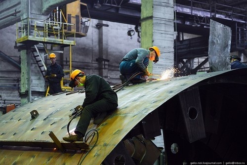 | Dây chuyền đóng tàu ngầm đang được vận hành hết công suất. |