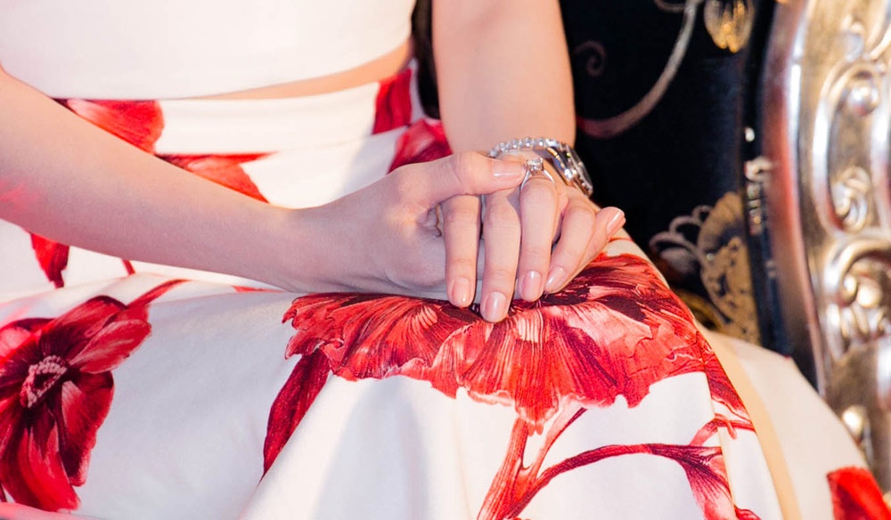 | Người đẹp rất hãnh diện và tự hào về món quà tình yêu. Cô luôn tạo dáng chụp hình để khoe chiếc nhẫn đính hôn mới được tặng của mình. |