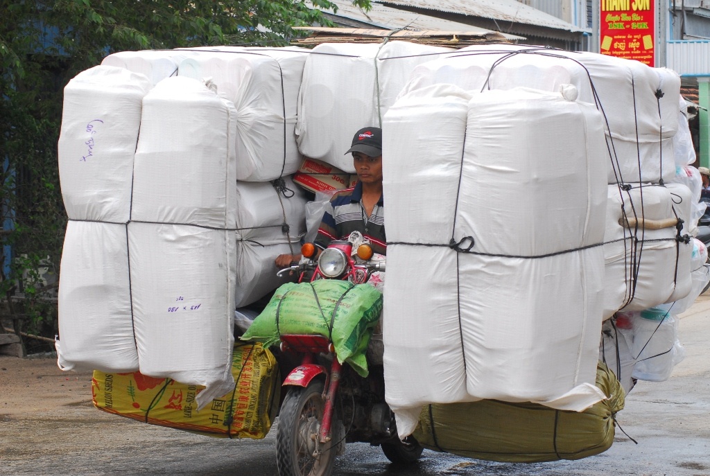 | Người phụ nữ Campuchia chở những bao nylon chất đầy trên chiếc xe gắn máy và cả phía tay lái, chỉ cần sơ suất nhỏ là có thể gây ra tai nạn. |