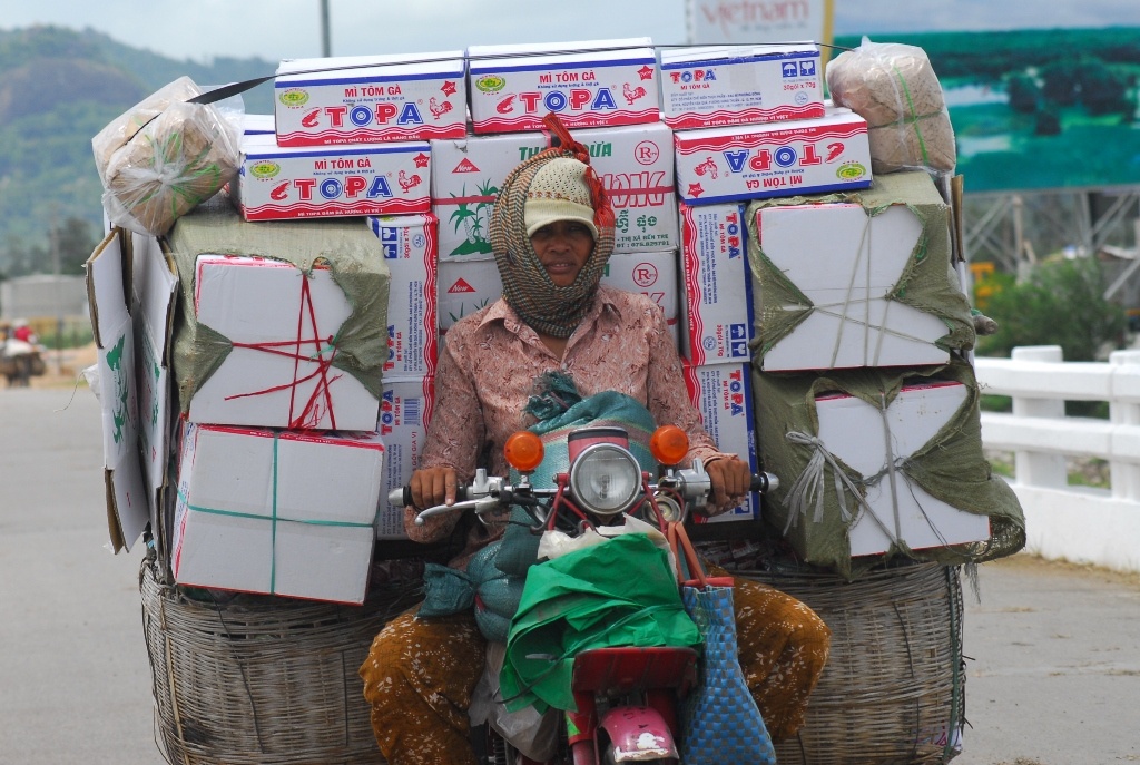 | Người đàn ông Campuchia chở hàng hóa cồng kềnh trên chiếc xe máy từ cửa khẩu Tịnh Biên đi về Campuchia. |