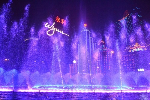 | Đài phun nước rực rỡ trước cửa sòng bạc Wynn. |