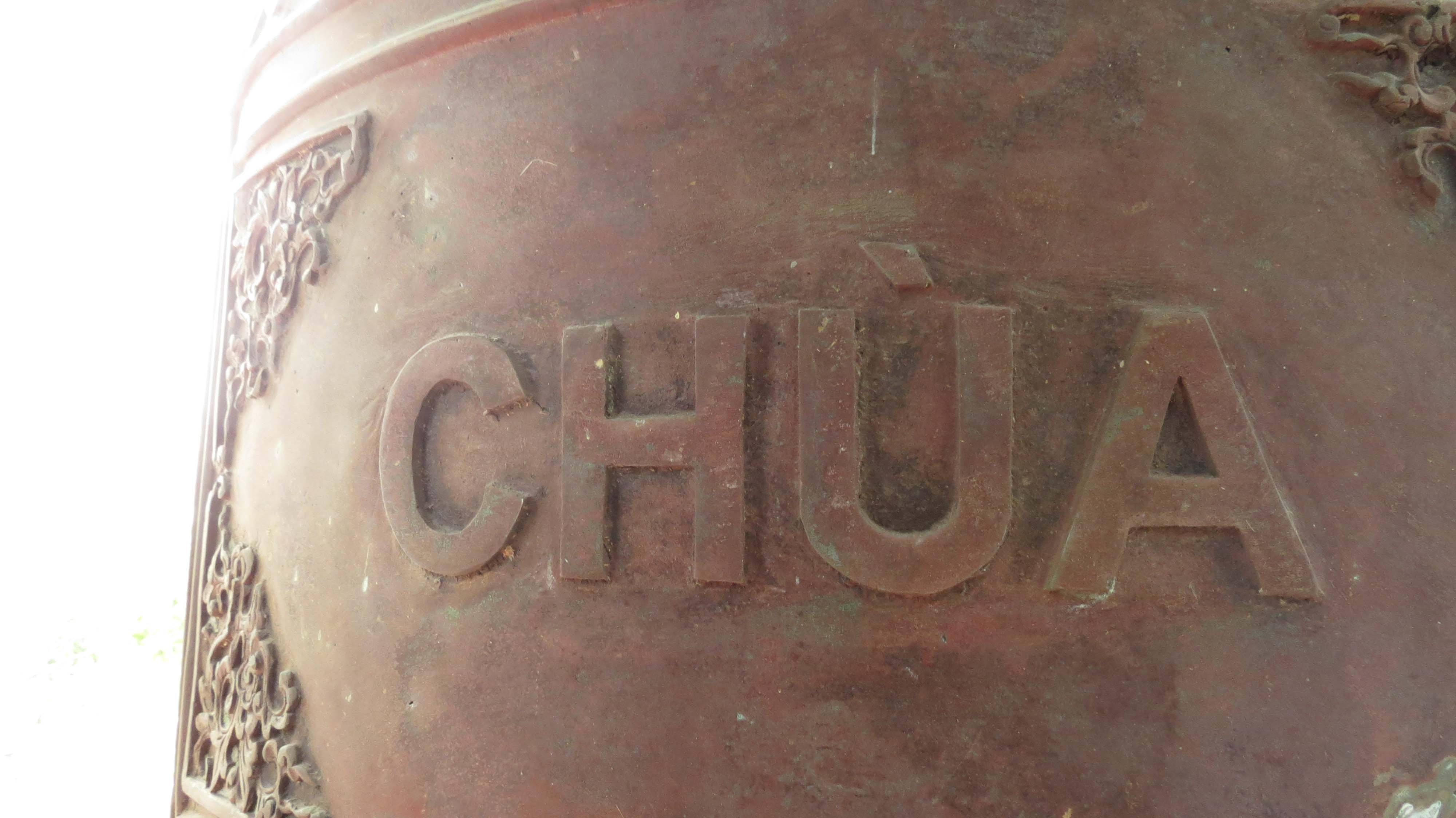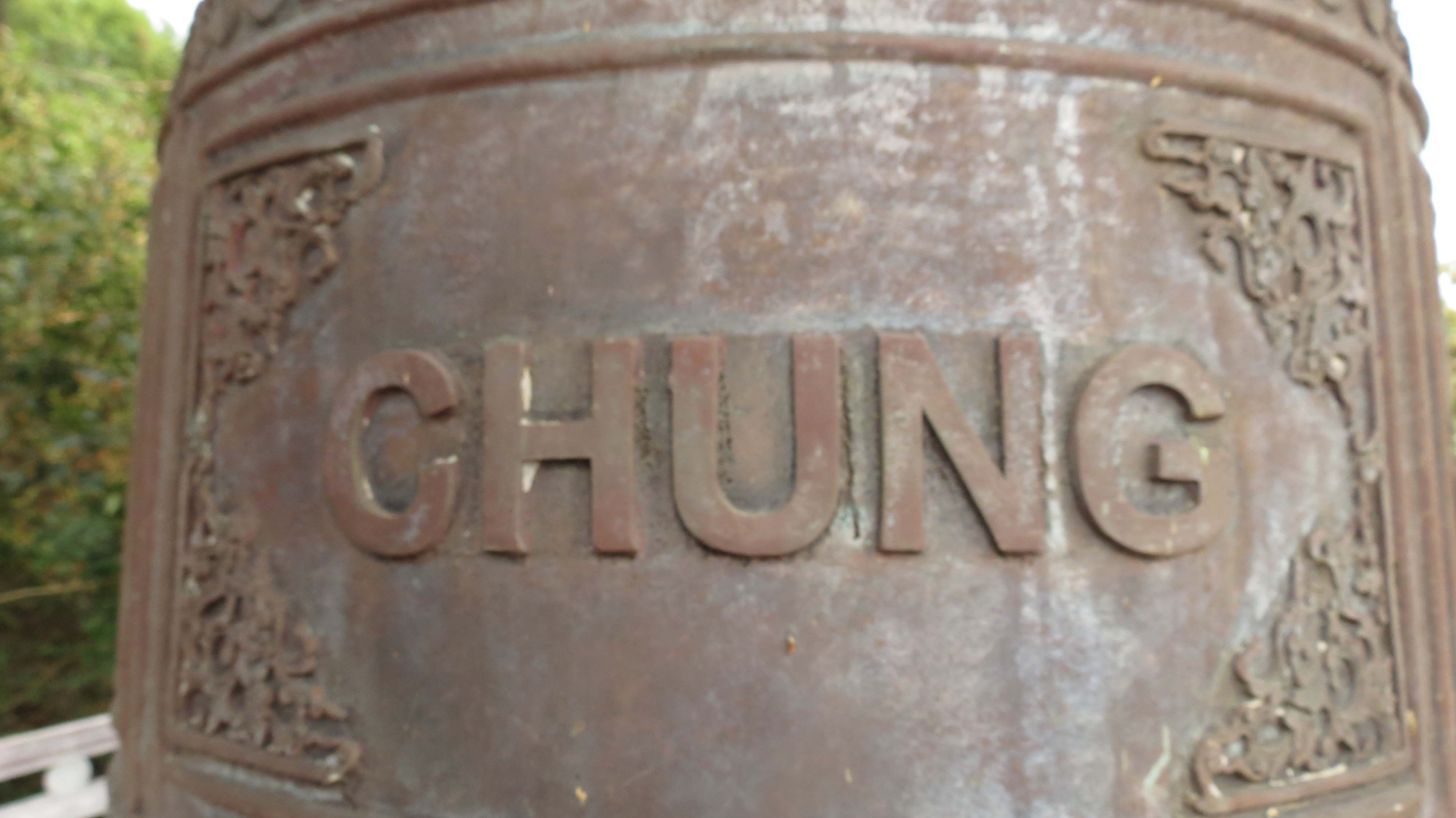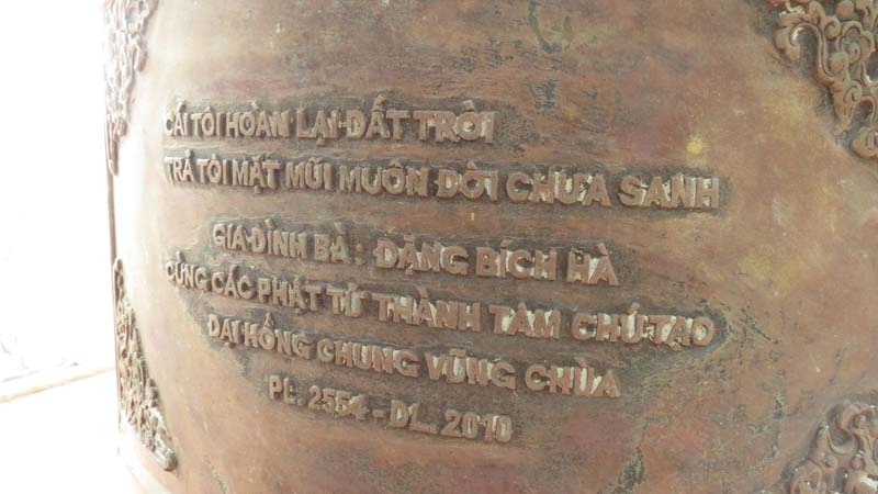 | Một tháp chuông trên đó có in tên của phu nhân Đại tướng Võ Nguyên Giáp cùng gia đình cung tiến. Bốn chữ lớn đúc vào chuông: “Vũng Chùa Hồng Chung”. |