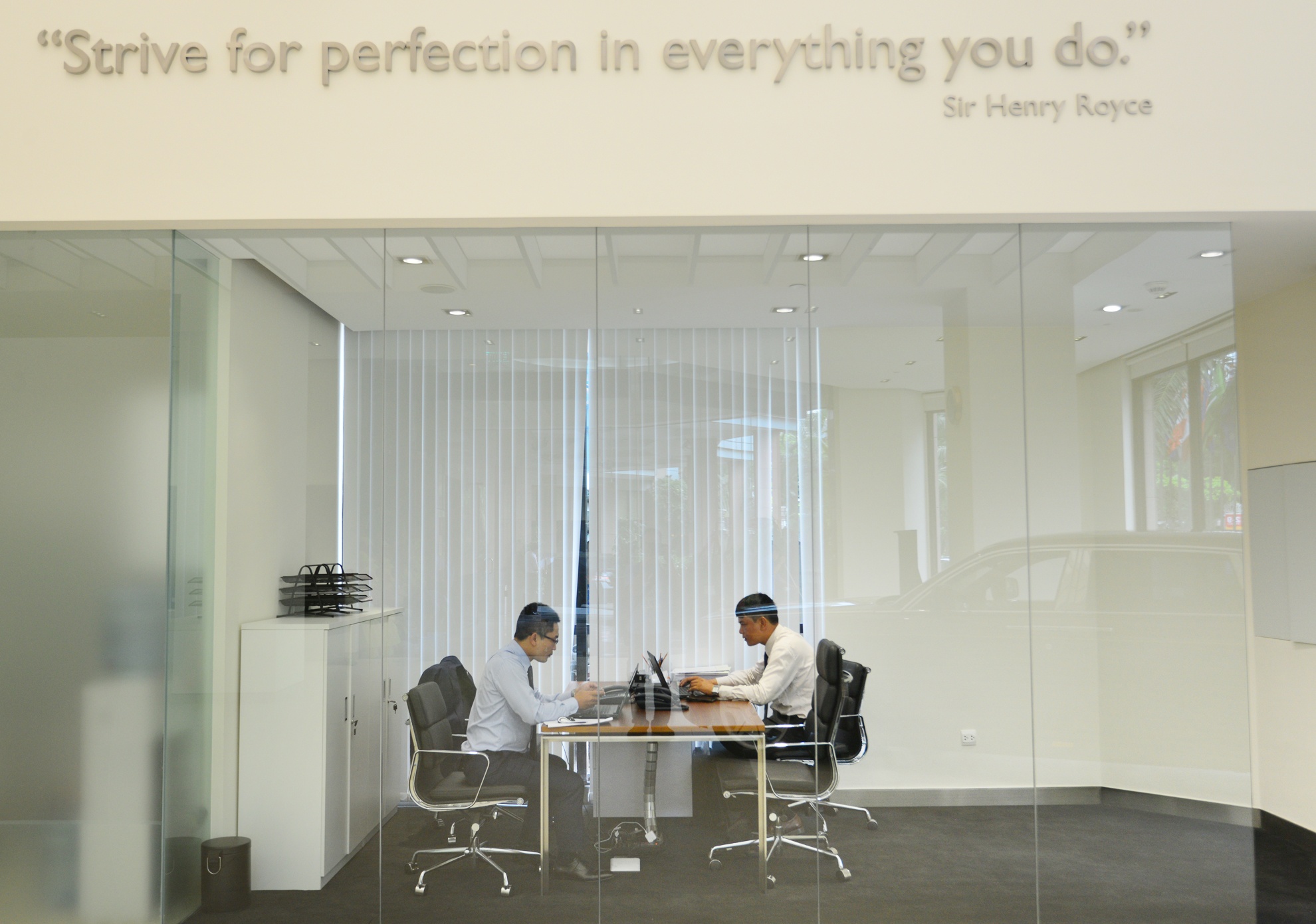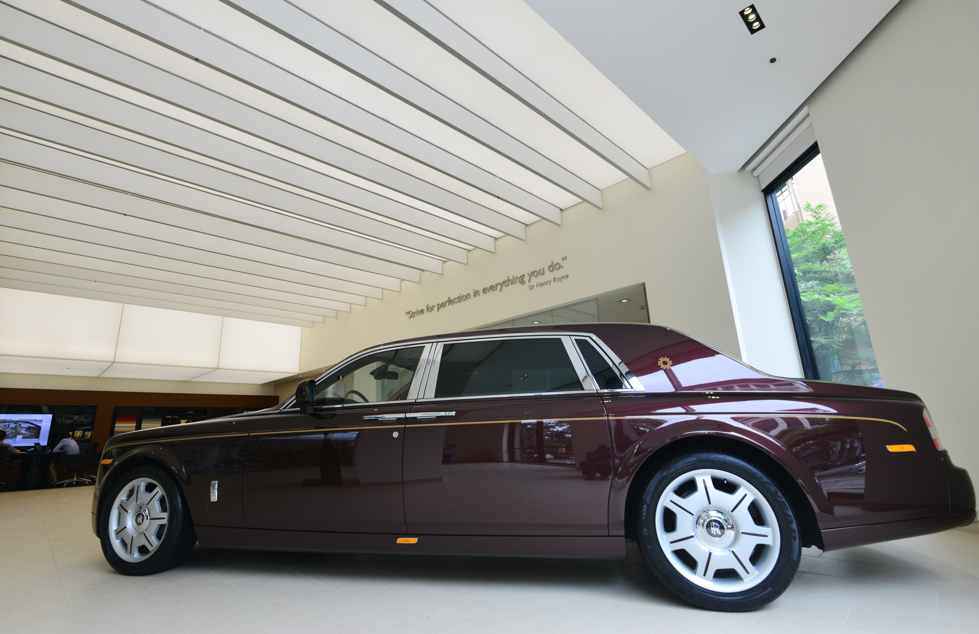 | Trên bức tường trung tâm của phòng trưng bày trích dẫn câu nói của nhà đồng sáng lập hãng xe Anh quốc Henry Royce: "Strive for perfection in everything you do" (tạm dịch: "Cố gắng đạt đến sự hoàn hảo trong mọi việc bạn làm"). |