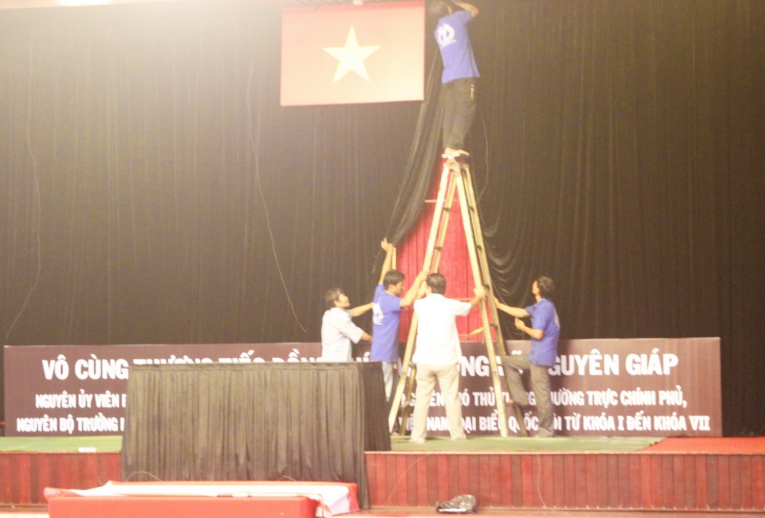 Công việc lắp đặt diễn ra khẩn trương để kịp ngày diễn ra Quốc tang Đại tướng. |