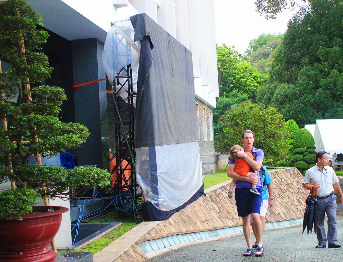 | Mái che nắng, mưa khá dài và chắc chắn được dựng trước cửa hội trường. |