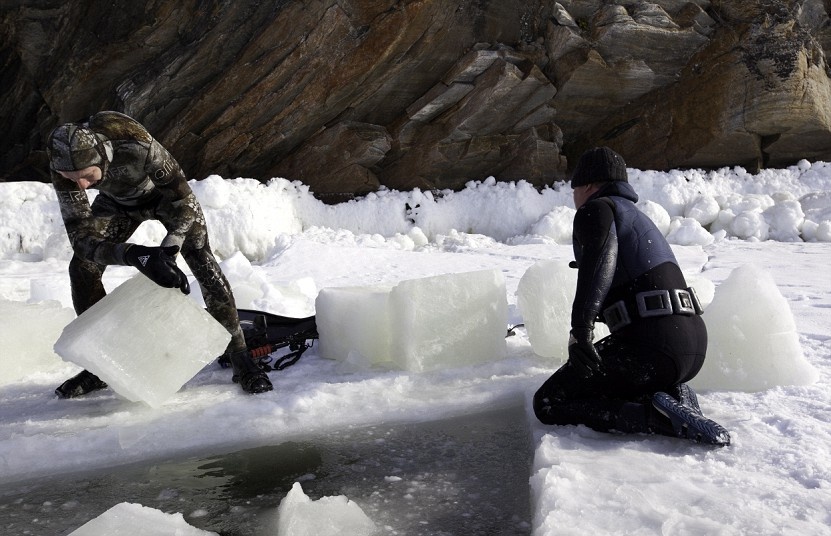 Những người thợ lặn cắt băng để chui xuống biển. Những lỗ này phải đủ rộng để nước không đông cứng lại trong thời gian ngắn.