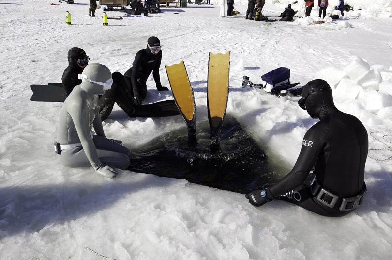 | Thợ lặn tập làm quen với làn nước lạnh giá trước khi xuống vùng biển sâu thẳm phía dưới. Sự thay đổi nhiệt độ bất thường có thể gây ra những phản ứng tiêu cực của cơ thể. |