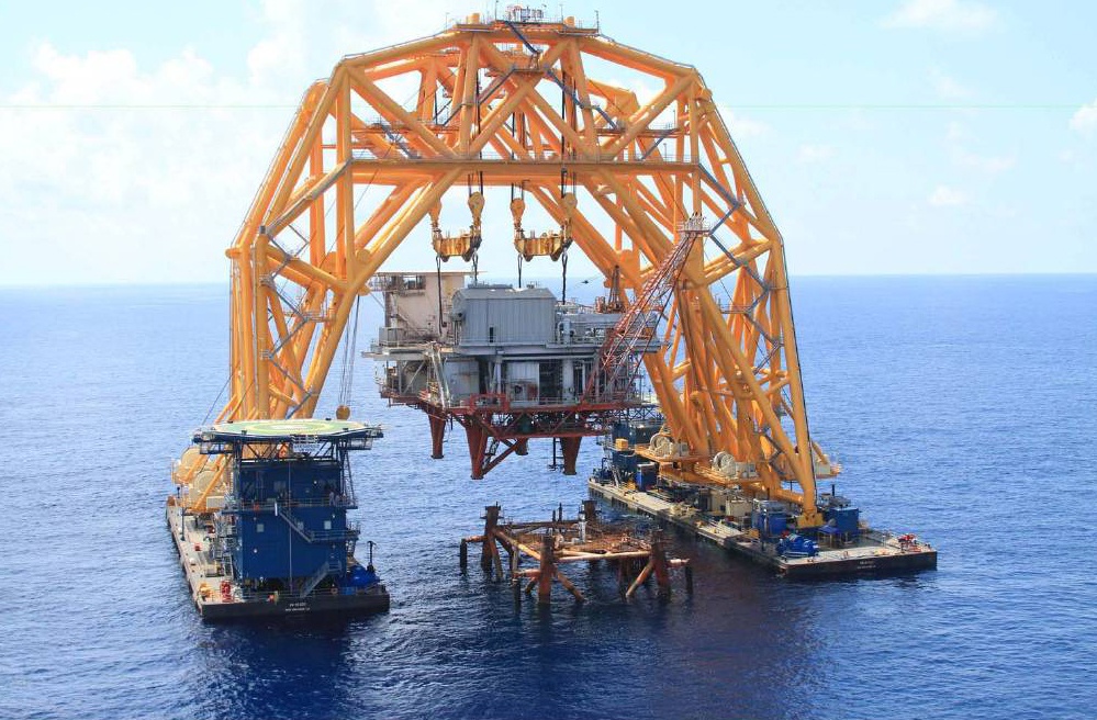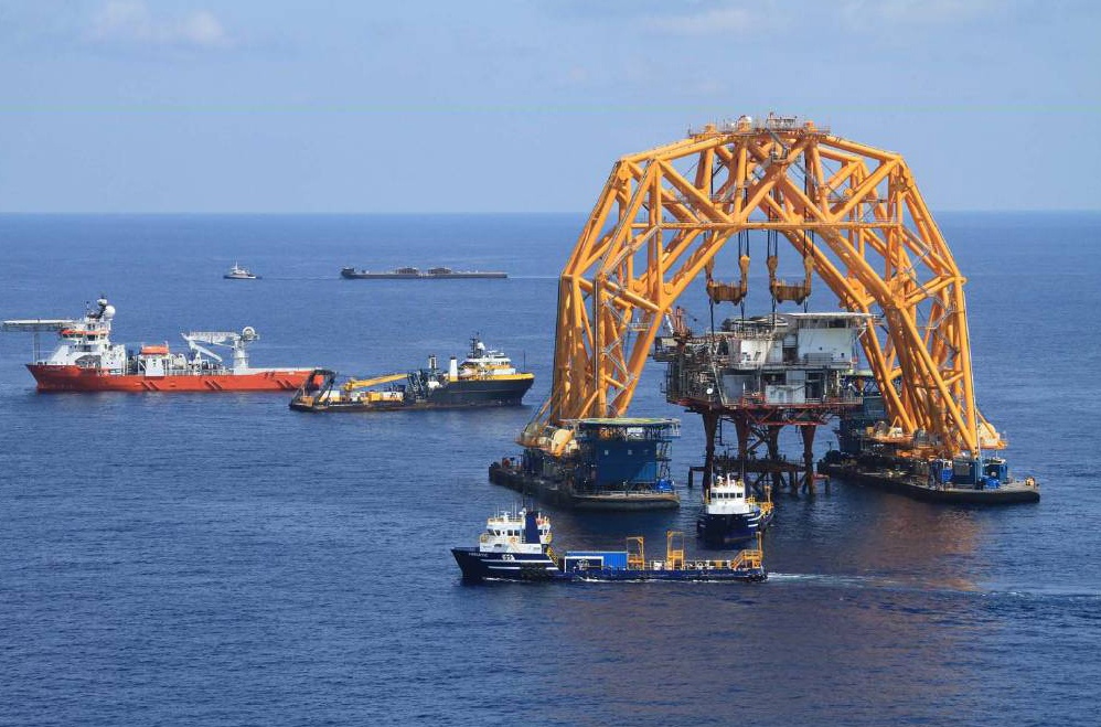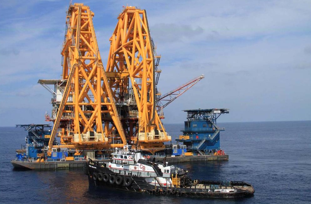 Tàu kéo đưa sà lan cùng giàn khoan vừa tháo dỡ về nơi xử lý. |
