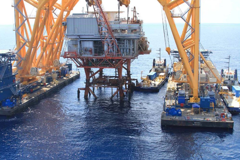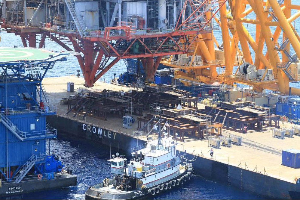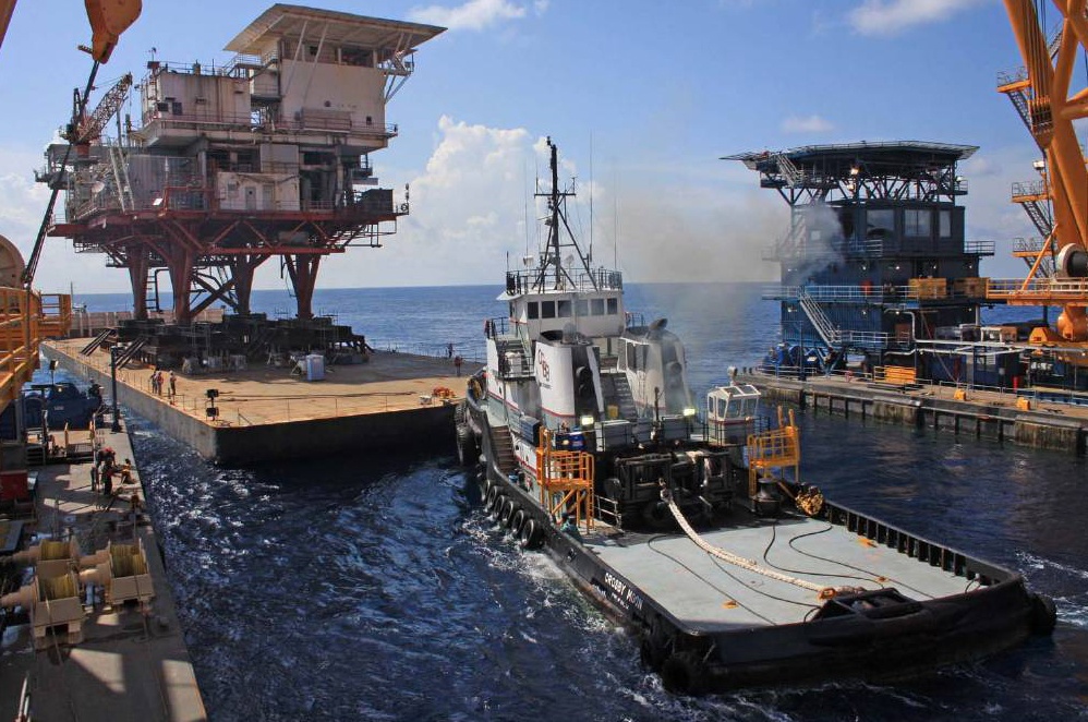 Các tàu kéo đưa Versabar VB 10.000 tới gần giàn khoan cần tháo dỡ. Thiết kế mái vòm giúp nó dễ dàng bao trọn diện tích những giàn khoan bằng sắt khổng lồ. |