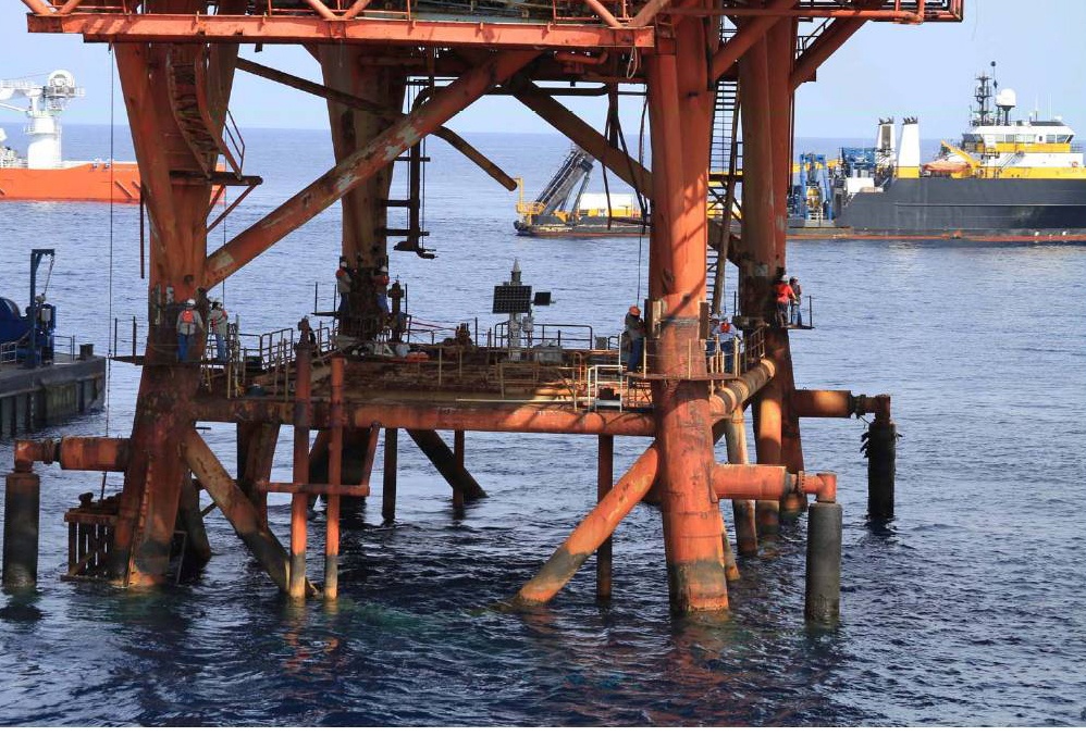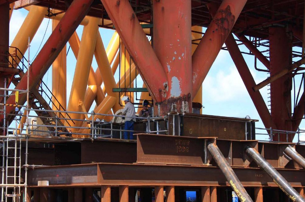 Người ta hàn cố định giàn khoan với các chân. Nó giúp khối kim loại khổng lồ đứng vững trước sóng to gió lớn. Tuy nhiên, các công nhân phải cắt rời những mối nối để cần cẩu nhấc phần trên của giàn khoan khỏi vị trí cũ. |